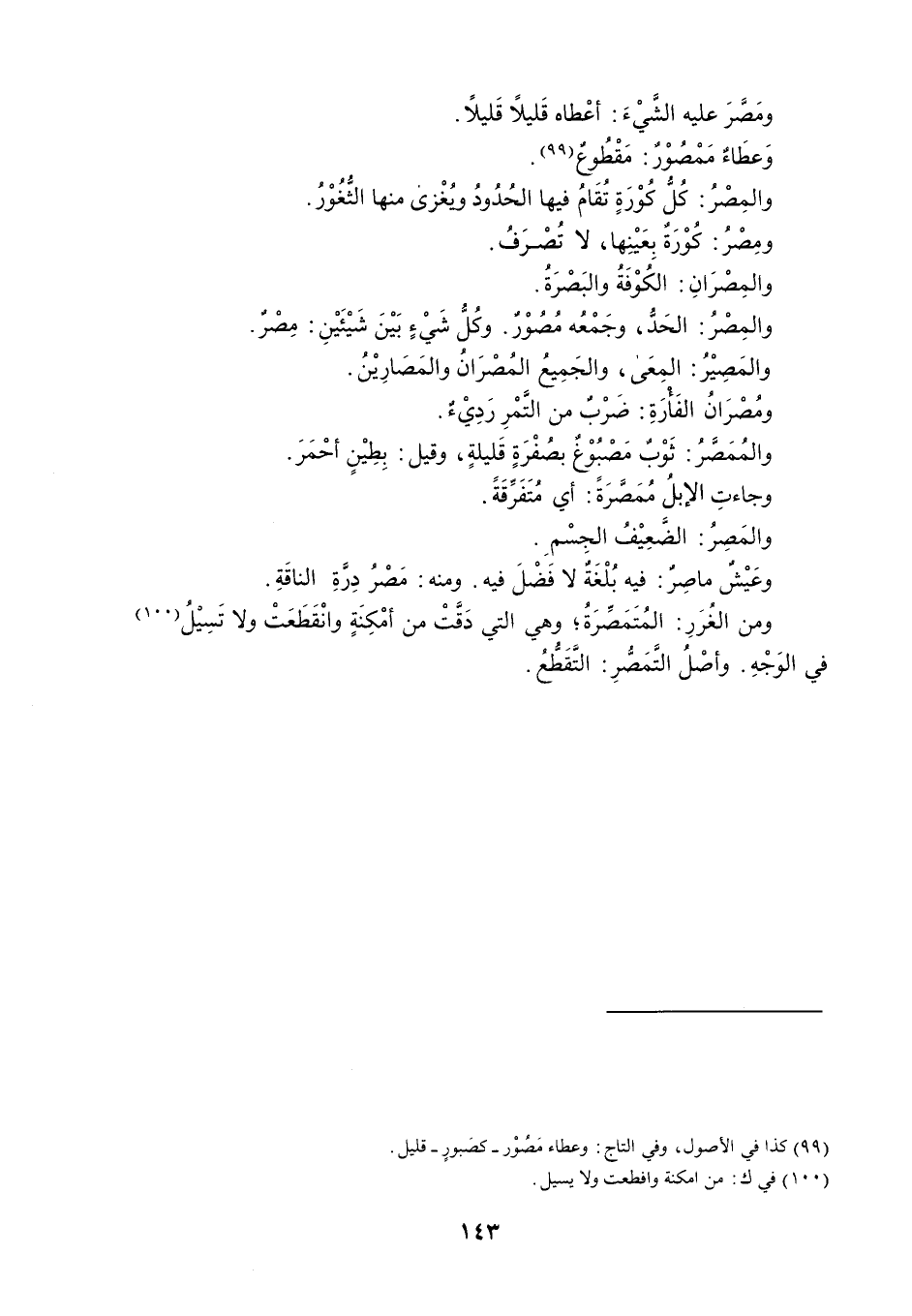 ومَصَّرَ عليه الشيْءَ : أعْطاه قَليلاً قَليلاً . وَعطَاءٌ مَمْصُوْر : مَقْطُوع . والمِصْرُ : كُلّ كوْرَةٍ تقَامُ فيها الحُدُودُ وُيغْزى منها الثُّغُوْرُ . ومِصْرُ : كُوْرَة بِعَيْنِها ، لا تُصْرَفُ . والمِصْرانِ : الكُوْفَة والبَصْرَةُ . والمِصْرُ : الحَدُّ ، وجَمْعُه مُصوْرٌ . وكُلُّ شَيْءٍ بَيْنَ شَيْئَيْنِ : مِصْرٌ . والمَصِيْرُ : المِعَى ، والجَمِيع المُصْرَانُ والمَصَارِيْنُ . ومُصْرَانُ الفَأْرَةِ : ضَرْبٌ من التَمْرِ رَدِيْءٌ . والمُمَصَّرُ : ثَوْب مَصْبُوْغٌ بصُفْرَةٍ قَليلةٍ ، وقيل : بِطِيْنٍ أحْمَرَ . وجاءتِ الإبلُ مُمَصرَةً : أي متَفَرقَةً . والمصر : الضعِيْفُ الجِسْمِ . وعَيْش ماصِر : فيه بُلْغَة لا فَضْلَ فيه . ومنه : مَصْرُ دِرَّةِ الناقَةِ . ومن الغرَرِ : المُتَمَصِّرَةُ ؛ وهي التي دَقَّتْ من أمْكِنَةٍ وانْقَطَعَتْ ولا تَسِيلُ في الوَجْهِ . وأصْل التَّمَصُّرِ : التقَطُّع .