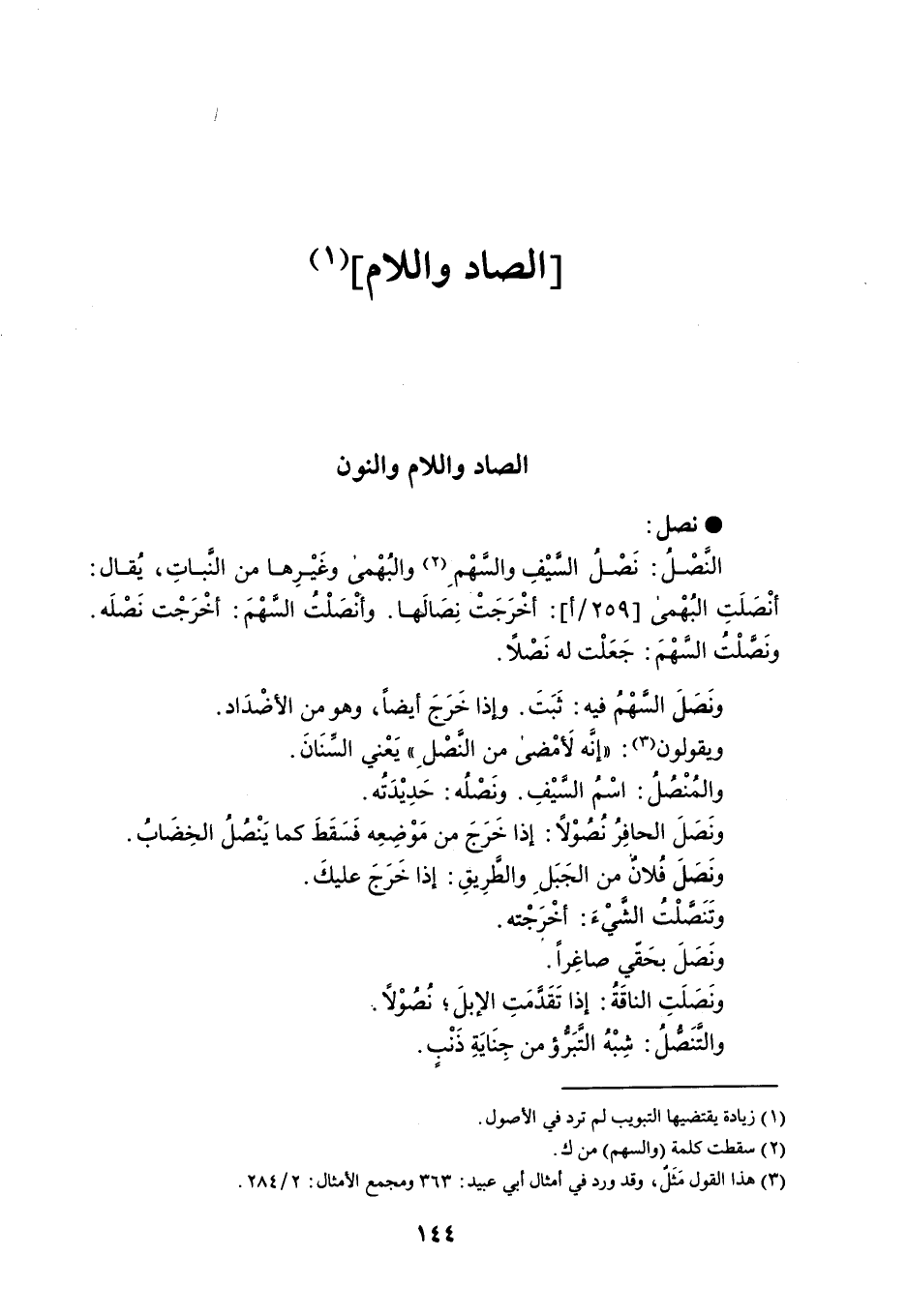 نصل النَّصْلُ : نَصْلُ السيْفِ والسَّهْمِ والبُهْمى وغَيْرِها من النباتِ ، يُقال : أنْصَلَتِ البُهْمى : أخْرَجَتْ نِصَالَها . وأنْصَلْتُ السهْمَ : أخْرَجْت نَصْلَه . ونَصْلتُ السهْمَ : جَعَلْت له نَصْلاً . ونَصَلَ السهْمُ فيه : ثَبَتَ . وإذا خَرَجَ أيضاً ، وهو من الأضْدَاد . ويقولون : ' إنَّه لَأمْضى من النَصْلِ ' يَعْني السنَانَ . والمُنْصُلُ : اسْمُ السيْفِ . ونَصْلُه : حَدِيْدَتُه . ونَصَلَ الحافِرُ نصُوْلاً : إذا خَرَجَ من مَوْضِعه فَسَقَطَ كما يَنْصُلُ الخِضَابُ . ونَصَلَ فُلانٌ من الجَبَلِ والطرِيقِ : إذا خَرَجَ عليكَ . وتَنَصلْت الشيْءَ : أخَرجْته . ونَصَلَ بحَقْي صاغِراً . ونَصَلَتِ الناقَةُ : إذا تَقَدمَتِ الإبلَ ؛ نُصُوْلاً . والتَنَصلُ : شِبْهُ التَبَرؤ من جِنَايَةِ ذنبٍ .