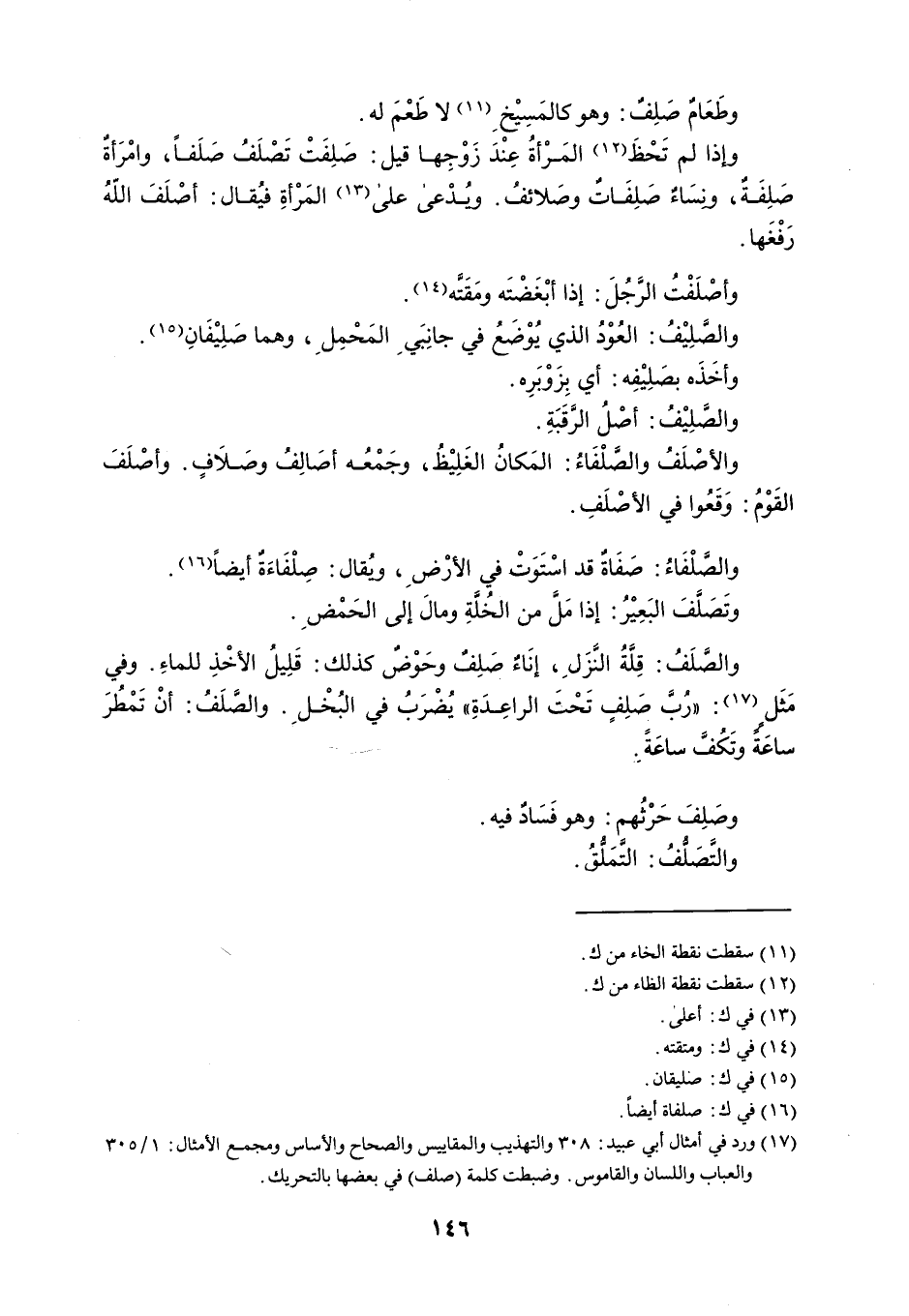 وطَعَامٌ صَلِفٌ : وهو كالمَسِيْخِ لا طَعْمَ له . وإذا لم تَحْظَ المَرْأةُ عِنْدَ زَوْجِها قيل : صَلِفَتْ تَصْلَف صَلَفاً ، وامْرَأةٌ صَلِفَةٌ ، ونسَاءٌ صَلِفَاتٌ وصَلائفُ . وُيدْعى على المَرْأةِ فيُقال : أصْلَفَ اللّهُ رَفْغَها . وأصْلَفْتُ الرَّجُلَ : إذا أبْغَضْتَه ومَقَتَّه . والصلِيْفُ : العُوْدُ الذي يُوْضَعُ في جانِبَيِ المَحْمِلِ ، وهما صَلِيْفَانِ . وأخَذَ بصَلِيْفِه : أي بِزَوْبَرِه . والصلِيْفُ : أصْلُ الرقَبَةِ . والأصْلَفُ والصلْفَاءُ : المَكانُ الغَلِيْظُ ، وجَمْعُه أصَالِفُ وصَلَافٍ . وأصلَفَ القَوْمُ : وَقَعُوا في الأصْلَفِ . والصلْفَاءُ : صَفَاةٌ قد اسْتَوَتْ في الأرْضِ ، ويُقال : صِلْفَاءَةٌ أيضاً . وتَصَلَّفَ البَعِيْرُ : إذا مَلَّ من الخُلَّةِ ومالَ إلى الحَمْضِ . والصَّلَفُ : قِلَّةُ النّزَلِ ، إنَاءٌ صَلِفٌ وحَوْضٌ كذلك : قَلِيلُ الأخْذِ للماءِ . وفي مَثَل : ' رُب صَلِفٍ تَحْتَ الراعِدَةِ ' يُضْرَب في البُخْلِ . والصلَفُ : أنْ تَمْطُرَ ساعَة وتَكُف ساعَة . وصَلِفَ حَرْثُهم : وهو فَسَادٌ فيه . والتَصَلفُ : التَمَلُّقُ .