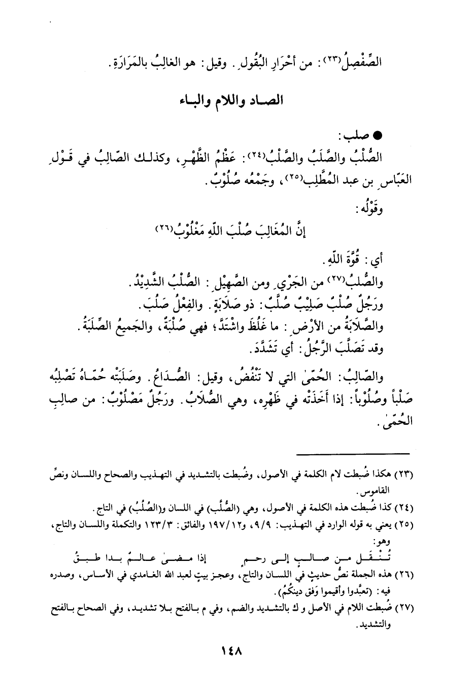 صلب الصلْبُ والصَّلَبُ والصلْبُ : عَظْمُ الظَّهْرِ ، وكذلك الصّالِبُ في قَوْل العَبّاسِ بن عبد المُطَلِب ، وجَمْعُه صُلُوْبٌ . وقَوْلُه : إنَ المُغَالِبَ صُلْبَ اللّهِ مَغْلُوْبُ أي : قُوَّةَ اللّهِ . والصُّلبُ من الجَرْيِ ومن الصَّهِيْلِ : الصلْبُ الشَّدِيْدُ . ورَجُلٌ صُلْبٌ صَلِيْبٌ صُلبٌ : ذو صَلاَبَةٍ . والفِعْلُ صَلُبَ . والصَّلَابَةُ من الأرْضِ : ما غَلُظَ واشْتَد ؛ فهي صُلْبَةٌ ، والجَميعُ الصِّلَبَة . وقد تَصَلبَ الرجُلُ : أي تَشَدَّدَ . والصّالِبُ : الحُمّى التي لا تَنْفُض ، وقيل : الصُّدَاعُ . وصَلَبَتْه حُمّاهُ تَصْلِبُه صَلْباً وصُلُوْباً : إذا أَخَذَتْه في ظَهْرِه ، وهى الصُّلَابُ . ورَجُلٌ مَصْلُوْبٌ : من صالِبِ الحُمّى .