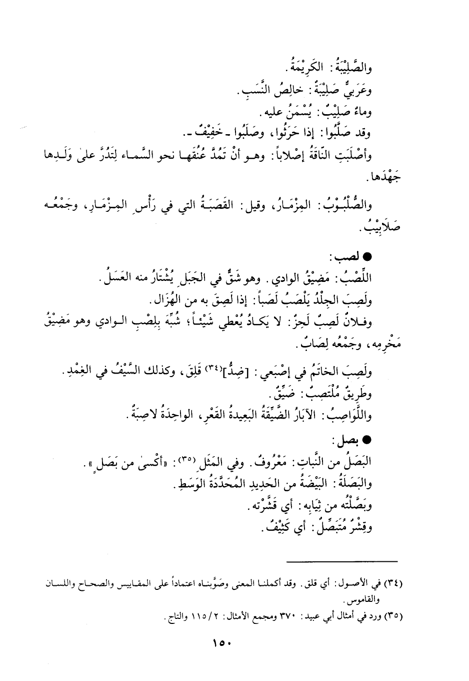 والصلِيْبَةُ : الكَرِيْمَةُ . وعَرَبي صَلِيْبَة : خالِصُ النسَبِ . وماء صَلِيْب : يُسْمَنُ عليه . قد صَلبُوا : إذا حَرَثُوا ، وصَلَبُوا - خَفِيْف - . وأصْلَبَتِ النّاقَةُ إصْلاباً : وهو أنْ تَمُدَّ عُنُقَها نحو السَّماء لِتَدُرَّ على وَلَدِها جَهْدَها . والصُلْبُوْبُ : المِزْمَارُ ، وقيل : القَصَبَةُ التي في رَأْسِ المِزْمَارِ ، وجَمْعُه صَلاَبِيْبُ . لصب اللصبُ : مَضِيْقُ الوادي . وهو شَقٌ في الجَبَلِ يُشْتَارُ منه العَسَلُ . ولَصِبَ الجِلْدُ يَلْصَبُ لَصَباً : إذا لَصِقَ به من الهُزَال . وفلانٌ لَصِبٌ لَحِز : لا يَكادُ يُعْطي شَيْئاً ؛ شُبِّهَ بِلِصْبِ الواديَ وهو مَضِيْق مَخْرِمِه ، وجَمْعُه لِصَابٌ . ولَصِبَ الخاتَمُ في إصْبَعي : صِدُّ قَلِقَ ، وكذلك السيْفُ في الغِمْدِ . وطَرِيق مُلْتصبٌ : ضَيِّق . واللوَاصِبُ : الآبَارُ الضَّيِّقَةُ البَعِيدةُ القَعْرِ ، الواحِدَةُ لاصِبَةٌ . بصل البَصَلُ من النباتِ : مَعْرُوفٌ . وفي المَثَلِ : ' أكْسى من بَصَلٍ ' . والبَصَلَةُ : البَيْضَةُ من الحَدِيدِ المُحَدَّدَةُ الوَسَطِ . وبَصلْتُه من ثِيَابِه : أي قَشَرْته . وقِشْرٌ مُتَبَصِّلٌ : أي كَثِيْفٌ .