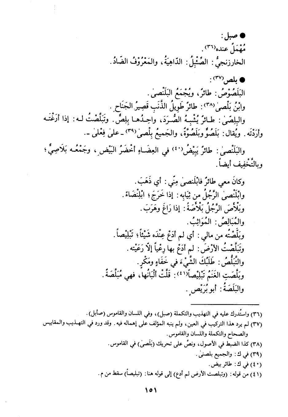 صبل مُهْمَلٌ عنده . الخارزنجي : الصئبل : الدّاهِيَةُ ، والمَعْرُوْفُ الضادُ . بلص البَلَصُوْصُ : طائرٌ ، ويُجْمَعُ البَلَنْصى . وابْنُ بَلْصى : طائرٌ طَوِيلُ الذَّنَبِ قَصِيرُ الجَنَاحِ . والبِلِصى : طائرٌ يُشْبِهُ الصُّرَدَ ، واحِدُها بِلِصٌّ . وتَبَلصْتُ له : إذا أرَغْتَه وأرَدْتَه . وُيقال : بَلَصُوٌ وبَلَصُوةٌ ، والجَميعُ بِلْصى - على فِعْلى - . والبَلَنْصى : طائرٌ يَبِيْضُ في العِضَاهِ أخْضَرُ البَيْضِ ، وجَمْعُه بَلَاصِي ؛ وبالتَخْفِيف أيضاً . وكانَ معي طائرٌ فابْلَنصى مِنّي : أي ذَهَبَ . وابْلَنْصى الرجُلُ من ثِيَابِه : إذا خَرَجَ ؛ ابْلِنْصَاءً . وبَلْأصَ الرَّجُلُ بَلْأصَةً : إذا رَاغَ وهَرَبَ . والمُبَالِصُ : المُوَاثِبُ . وبَلَّصْتُه من مالي : أي لم أدَعْ عِنْدَه شَيْئاً ؛ تَبْلِيْصاً . وتَبَنَصْتُ الأرْضَ : لم أدَعْ بها رِعْياً إلّا رَعَيْته . والتَبَلُّصُ : طَلَبُكَ الشَّيْءَ في خَفَاءٍ ومَكْرٍ . وبَلَّصَتِ الغَنَمُ تَبْلِيْصاً : قَلَّتْ ألْبَانُهما ، فهي مُبَلَّصَةٌ . والبَلَصَةُ : أبو بُرَيْصٍ .