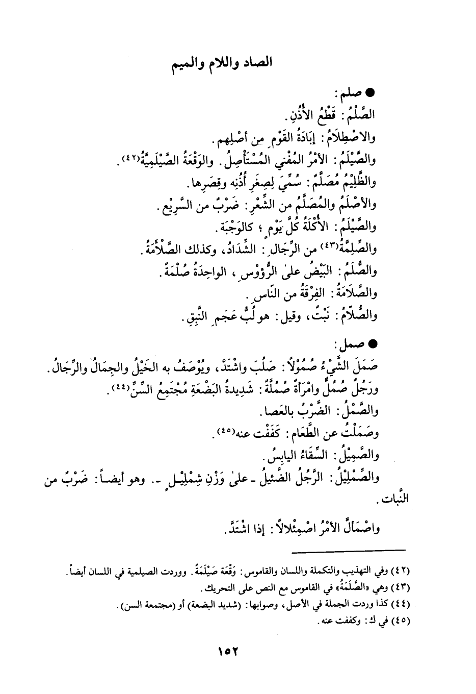 صلم الصلْمُ : قَطْعُ الأذُنِ . والاصْطِلاَمُ : إبَادَةُ القَوْمِ من أصْلِهم . والصيْلَمُ : الأمْرُ المُفْني المُسْتَاْصِلُ . والوَقْعَةُ الصَّيْلَمِيةُ . والظلِيْمُ مُصَلمٌ : سُقَيَ لِصِغَرِ أُذُنِه وقِصَرِها . والأصْلَمُ والمُصَلمُ من الشعْرِ : ضَرْبٌ من السرِيْع . والصيْلَمُ : الأكْلَةُ كُل يَوْم ؛ كالوَجْبَة . والصلِمةُ من الرِّجَالِ : الشِّدَادُ ، وكذلك الصلْأمَةُ . والصُّلَمُ : البَيْضُ على الرُّؤوْسِ ، الواحِدَةُ صُلْمَةٌ . والصلاَمَةُ : الفِرْقَةُ من الناسِ . والصُّلاّمُ : نَبْتُ ، وقيل : هو لُب عَجَمِ النَبِقِ . صمل صَمَلَ الشَّيْءُ صُمُوْلاً : صَلُبَ واشْتَدَّ ، وُيوْصَفُ به الخَيْل والجِمَالُ والرِّجَالُ . ورَجُل صُمُلُّ وامْرَأةٌ صُمُلةٌ : شَدِيدةُ البَضةِ مُجْتَمِعُ السِّنَ . والصمْلُ : الضَرْبُ بالعَصا . وصَمَلْتُ عن الطَعَام : كَفَفْت عنه . والصمِيْلُ : السِّقَاءُ اليابِسُ . والصِّمْلِيْلُ : الرَّجُلُ الضئيلُ - على وَزْنِ شِمْلِيْلٍ - . وهو أيضاً : ضَرْبٌ من النَبات . واصْمَأل الأمْرُ اصْمِئْلالاً : إذا اشْتَدَّ .