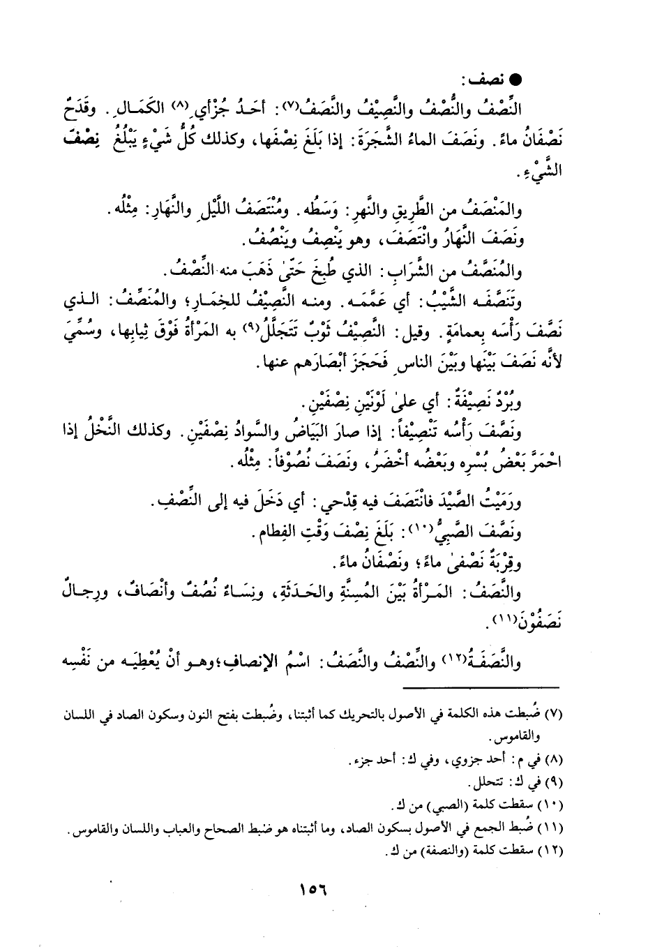 نصف النَصْفُ والنصْفُ والنَّصِيْفُ والنَّصَفُ : أحَدُ جُزْأيِ الكَمَالِ . وقَدَحٌ نَصْفَانُ ماءً . ونَصَفَ الماءُ الشَّجَرَةَ : إذا بَلَغَ نِصْفَها ، وكذلك كُلًّ شَيْءٍ يَبْلُغ نِصْف الشيْءِ . والمَنْصَفُ من الطَرِيقِ والنَهرِ : وَسَطُه . ومُنْتَصَفُ النَيْلِ والنهَارِ : مِثْلُه . ونَصَفَ النهَارُ وانْتَصَفَ ، وهو يَنْصِفُ وَينْصُفُ . والمُنَضَفُ من الشرَابِ : الذي طُبخَ حَتّى ذَهَبَ منه النِّصْفُ . وتَنَصَّفَه الشيْبُ : أي عَمَّمَه . ومنه النَّصِيْفُ للخِمَارِ ؛ والمُنَصفُ : الذي نَصفَ رَأْسَه بِعمامَةٍ . وقيل : النَّصِيْفُ ثَوْبٌ تَتَجَلَّلُ به المَرْأةُ فَوْقَ ثِيابِها ، وسُميَ لأنَه نَصَفَ بَيْنَها وبَيْنَ الناسِ فَحَجَزَ أبْصَارَهم عنها . وبُرْد نَصِيْفَةٌ : أي على لَوْنَيْنِ نِصْفَيْنِ . ونَصفَ رَأْسُه تَنْصِيْفاً : إذا صارَ البَيَاضُ والسوادُ نِصْفَيْنِ . وكذلك النَخْلُ إذا احْمَر بَعْضُ بُسْرِه وبَعْضُه أخْضَرُ ، ونَصَفَ نُصُوْفاً : مِثْلُه . ورَمَيْتُ الصيْدَ فانْتَصَفَ فيه قِدْحي : أي دَخَلَ فيه إلى النِّصْفِ . ونَصفَ الصَبِيُّ : بَلَغَ نِصْفَ وَقْتِ الفِطام . وقِرْبَة نَصْفى ماءً ؛ ونَصْفَانُ ماءً . والنَّصَفُ : المَرْأةُ بَيْنَ المُسِنَةِ والحَدَثَةِ ، ونسَاءٌ نُصُفٌ وأنْصَافٌ ، ورِجالٌ نَصَفُوْنَ . والنَصَفَةُ والنِّصْفُ والنَصَفُ : اسْمُ الإنصافِ ؛ وهو أنْ يُعْطِيَه من نَفْسِه