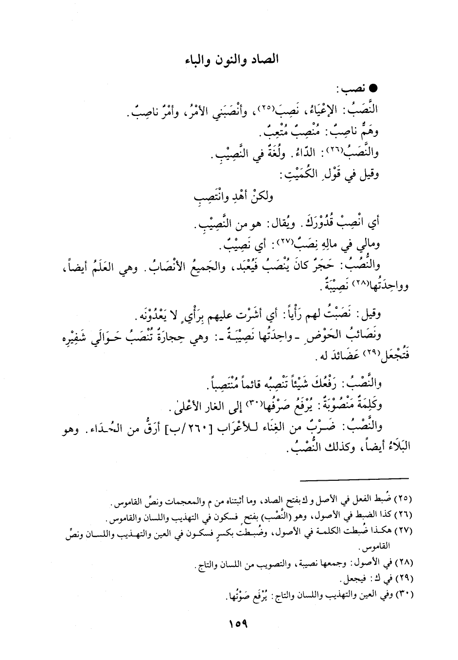 نصب النصَبُ : الإعْيَاءُ ، نَصِبَ ، وأنْصَبَني الأمْرُ ، وأمر ناصِبٌ . وهَم ناصِب : مُنْصب مُتْعِب . والنصَبُ : الدّاءُ . ولُغَة في النَّصِيْب . وقيل في قَوْلِ الكُمَيْتِ : ولكنْ أهْدِ وانْتَصبِ أي انْصِبْ قُدُوْرَكَ . ويُقال : هو من النَصيْبِ . ومالي في مالِهِ نِصَب : أي نَصِيْبٌ . والنُصبُ : حَجَرٌ كانَ يُنْصَب فَيُعْبَد ، والجَميعُ الأنْصَابُ . وهي العَلمُ أيضاً ، وواحِدَتُها نَصِيْبَة . وقيل : نَصَبْتُ لهم رَأْياً : أي أشَرْت عليهم بِرَأْيٍ لا يَعْدُوْنَه . ونَصَائبُ الحَوْضِ - واحِدَتُها نَصِيْبَة - : وهي حِجارَة تُنْصَبُ حَوَالَي شَفِيْرِه فَتُجْعَل عَضَائدَ له . والنصْبُ : رَفْعُكَ شَيْئاً تَنْصِبُه قائماً مُنْتَصِباً . وكَلِمَة مَنْصُوْبَة : يُرْفَعُ صَرْفُها إلى الغار الأعْلى . والنصْبُ : ضرْبٌ من الغِنَاء للأعْرَاب أرَقُّ من الحداء . وهو البَلاَءُ أيضاً ، وكذلك النُّصْبُ .