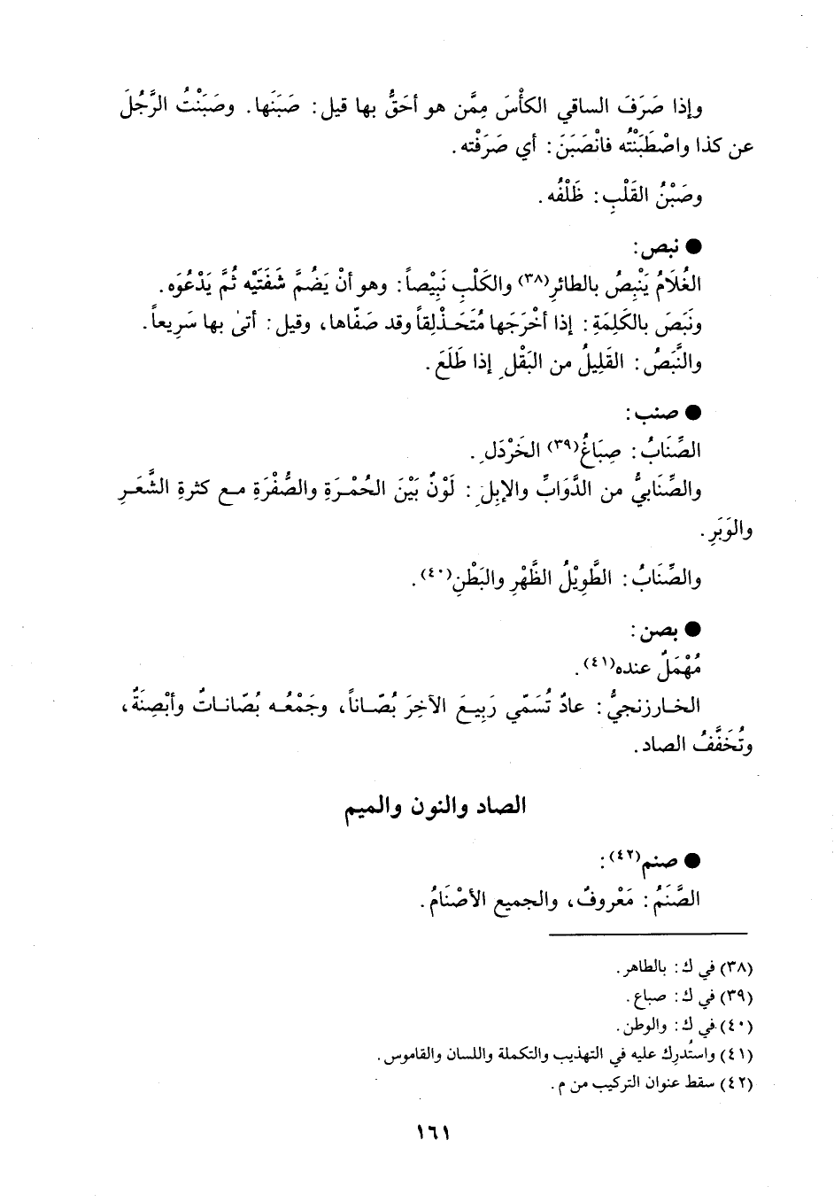 وإذا صَرَفَ الساقي الكأسَ مِمن هو أحَقُّ بها قيل : صبَنَها . وصَبَنْتُ الرجُلَ عن كذا واصْطَبَنْتُه فانْصَبَنَ : أي صَرَفْته . وصَبْنُ القَلْبِ : ظَلْفُه . نبص الغُلاَمُ يَنبِصُ بالطائرِ والكَلْبِ نَبِيْصاً : وهو أنْ يَضُم شَفَتَيْه ثُمَّ يَدْعُوَه . ونَبَصَ بالكَلِمَةِ : إذا أخْرَجَها مُتَحَذْلِقاً وقد صَفّاها ، وقيل : أتى بها سَرِيعاً . والنَبَصُ : القَلِيلُ من البَقْلِ إذا طَلَعَ . صنب الصنَابُ : صِبَاغُ الخَرْدَلِ . والصنابي من الدوَابَ والإبِلِ : لَوْن بَيْنَ الحُمْرَةِ والصُّفْرَةِ مع كثرةِ الشَّعَرِ والوَبَرِ . والصنَابُ : الطوِيْلُ الظَّهْرِ والبَطْنِ . بصن مُهْمَل عنده . الخارزنجيُ : عاد تُسَمّي رَبِيعَ الآخِرَ بُصّاناً ، وجَمْعُه بُصّانات وأبْصِنَةٌ ، وتُخَففُ الصاد .