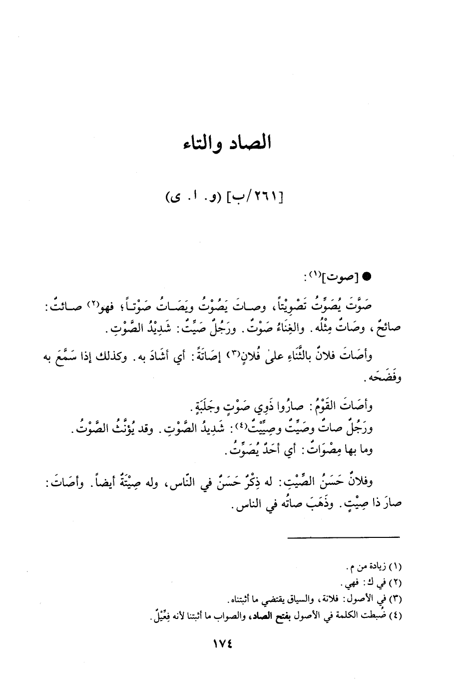 صوت صَوتَ يُصَوتُ تَصْوِيْتاً ، وصاتَ يَصُوْتُ وَيصَاتُ صَوْتاً ؛ فهو صائت : صائحٌ ، وصات مِثْلُه . والغِنَاءُ صَوْتٌ . ورَجُلٌ صَيتَ : شَدِيْدُ الصوْتِ . وأصَاتَ فلان بالثَّنَاءِ على فُلانٍ إصَاتَةً : أي أشَادَ به . وكذلك إذا سَمعَ به وفَضَحَه . وأصَاتَ القَومُ : صارُوا ذَوِي صَوْتٍ وجَلَبَةٍ . ورَجُل صات وصَيتٌ وصييْتٌ : شَدِيدُ الصوْتِ . وقد يُؤنَثُ الصوْتُ . وما بها مِصْوَات : أي أحَدٌ يُصَوتُ . وفلان حَسَنُ الصيْتِ : له ذِكْرٌ حَسَنٌ في النّاس ، وله صِيْتَةٌ أيضاً . وأصَاتَ : صارَ ذا صِيْتٍ . وذَهَبَ صاتُه في الناس .