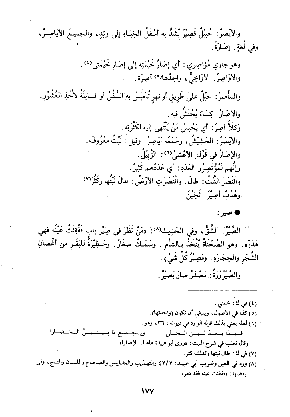 والأيْصَرُ : حُبَيْلٌ قَصِيْرٌ يُشَدُ به أسْفَلُ الخِبَاءِ إلى وتدٍ ، والجَميعُ الأيَاصِرُ ، وفي لُغَةٍ : إصَارَةَ . وهو جاري مُؤاصِري : أي إصَارُ خَيْمَتِه إلى إصَارِ خَيْمَتي . والأوَا صِرُ : الأوَاخِيُّ ، واحِدُها آصِرَة . والمَأْصَرُ : حَبْلٌ على طَرِيقٍ أو نهرٍ تُحْبَسُ به السُفُنُ أو السابِلَةُ لأخْذِ العُشُوْرِ . والاصَارُ : كِسَاءٌ يُحْتَشُ فيه . وَكَلأ آصِرٌ : أي يَحْبِسُ مَنْ يَنْتَهي إليه لكَثْرَتِه . والأيْصَرُ : الحَشِيْشُ ، وجَمْعُه أيَاصِرُ . وقيل : نَبْتٌ مَعْرُوفٌ . والإصَارُ في قَوْلِ الأعشى : الزَبِيْلُ . وإنَهم لَمُؤْتَصِرُو العَدَدِ : أي عَدَدُهم كَثِير . وائْتَصَرَ النبْتُ : طالَ . وائْتَصَرَتِ الأرْضُ : طالَ نَبْتُها وكَثُرَ . وهُدْب أصِيْرٌ : ثَخِيْنٌ . صير الصيْرُ : الشقُ ، وفي الحَدِيث : ' مَنْ نَظَرَ في صِيْرِ باب فَفُقِئَتْ عَيْنُه فهي هَدَر ' . وهو الصحْنَاةُ يُتَّخَذُ بالشأْمِ . وسَمَك صِغَارٌ . و حَظِيْرَةٌ للبَقَرِ من أغْصَانِ الشجَرِ والحِجَارَةِ . ومَصِيْر كُل شَيْءٍ . والصيْرُوْرَةُ : مَصْدَرُ صارَ يَصِيْرُ .
