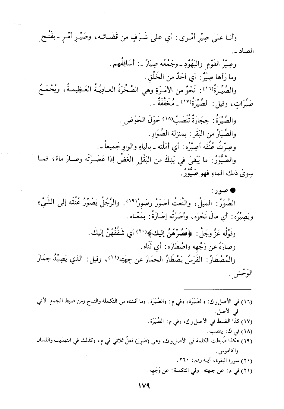 وأنا على صيْرِ أمْري : أي على شَرَفٍ من قَضَائه ، وصَيْرِ أمْرٍ - بفَتْحِ الصاد - . وصِيْرُ القَوْمِ واليَهُوْدِ - وجَمْعُه صِيَارٌ - : أسَاقِفُهم . وما رَآها صِيْرٌ : أي أحَدٌ من الخَلْقِ . والصيِّرَةُ : نَحْو من الأمَرَةِ وهي الصخْرَةُ العادِيَّةُ العَظِيمة ، ويُجْمَعُ صَيرَاتٍ ، وقيل : الصيْرَةُ - مُخَفَّفَة - . والصيْرَةُ : حِجَارَةٌ تنْصَبُ حَوْلَ الحَوْضِ . والصيَارُ من البَقَرِ : بمنزلة الصوَارِ . وصِرْتُ عُنُقَه أصِيْرُه : أي أمَلْته - بالياءِ والواوِ جَميعاً - . والصيُوْرُ : ما يَبْقى في يَدِكَ من البَقْلِ الغَض إذا عَصَرْتَه وصارَ ماءً ؛ فما سِوى ذلك الماءِ فهو صَيوْر . صور الصوَرُ : المَيَلُ ، والنَعْتُ أصْوَرُ وصَوِرٌ . والرَّجُلُ يَصُوْرُ عُنُقَه إلى الشَيْءِ وَبصِيْرُه : أي مالَ نَحْوَه ، وأصَرْتُه إصَارَةً : بمَعْناه . وقَوْلُه عَزَ وجَل : ' فَصُرْهُنَ إليك ' أي شَقِّقْهُنَّ إليكَ . وصارَهُ عن وَجْهِه واصْطَارَه : أي ثَنَاه . والمُصْطَارُ : الفَرَسُ يَصْطَارُ الحِمَارَ عن جِهَتِه ، وقيل : الذي يَصِيْدُ حِمَارَ الوَحْشَ .