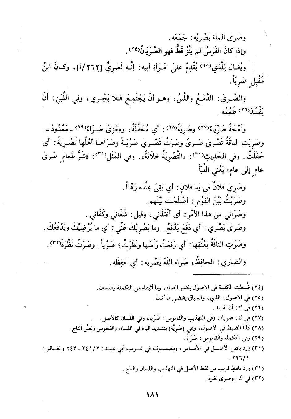 وصَرى الماءَ يَصْرِيْه : جَمَعَه . وإذا كانَ الفَرَسُ لم يَنْزُ قط فهو الصرْيَانُ . وُيقال لِلذي يُقْدِمُ على امْرَأةِ أبيه : إنه لَصَرِيٌّ ، وكانَ ابنُ مُقْبِلٍ صَرِياً . والصَّرى : الدمْعُ واللَّبَن وهو أنْ يَجْتَمِعَ فلا يَجْري ، وفي اللبَنِ : أنْ يَفْسُدَ طَعْمُه . ونَعْجَةٌ صرْيَاءُ وصَرِيَةٌ : أي محفلة ، ومِعْزى صَرَاءُ - مَمْدُودٌ - . وصَرِيَتِ الناقَةُ تَصْرى صَرىً وصَرَتْ تَصْري صَرْيَةً وصَرّاها أهْلُها تَصْرِيَةً : أي حَفَلَتْ . وفي الحَدِيثِ : ' المَّصْرِيَةُ خِلَابَةٌ ' . وفي المَثَل : ' شَرُ طَعامٍ صَرى عامٍ إلى عام ' يَعْني اللِّبَأَ . وصَرِيَ فلانٌ في يَدِ فلانٍ : أي بَقِيَ عِنْدَه رَهْناً . وصَرَيْتُ بَيْنَ القَوْمِ : أصْلَحْت بَيْنَهم . وصَرَاني من هذا الأمْرِ : أي أنْقَذَني ، وقيل : شفَاني وكَفَاني . وصَرى يَصْري : أي دَفَعَ يَدْفَعُ . وما يَصْرِيْكَ عَنّي : أي ما يُرْضِيْكَ وَيدْفَعكَ . وصَرَتِ الناقَةُ بعُنُقِها : أي رَفَعَتْ رَأْسَها ونَظَرَتْ ؛ صَرْياً . وصَرَتْ نَظْرَةً . والصاري : الحافِظُ ، صَرَاه اللّهُ يَصْرِيه : أي حَفِظَه .