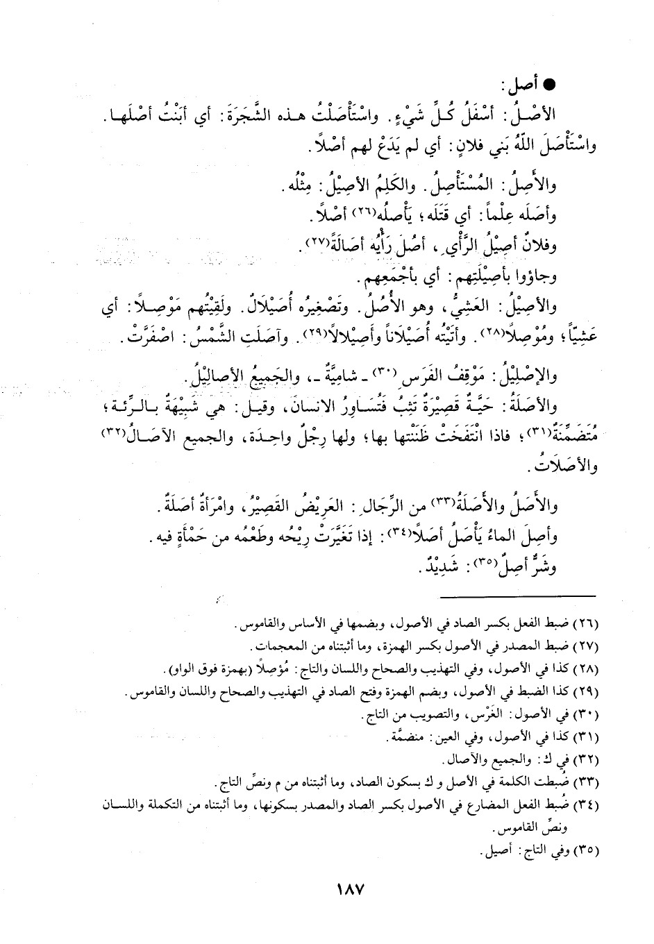 الأصْلُ : أسْفَلُ كُل شَيْءٍ . واسْتَأْصَلْتُ هذه الشَجَرَةَ : أي أبَنْتُ أصْلَها . واسْتَأْصَلَ اللهُ بَني فلانٍ : أي لم يَدَعْ لهم أصْلاً . والأصِلُ : المُسْتَأْصِلُ . والكلِمُ الأصِيْلُ : مِثْلُه . وأصَلَه عِلْماً : أي قَتَلَه ؛ يَأصلُه أصلاً . وفلان أصِيْلُ الرأْيِ ، أصُلَ رَأيُه أصَالَةً . وجاؤوا بأصِيْلَتِهم : أي بأجْمَعِهم . والأصِيْلُ : العَشِيُ ، وهو الأصُلُ . وتَصْغِيرُه أُصَيْلاَلٌ . ولَقِيْتُهم مَوْصِلاً : أي عَشِياً ؛ ومُوْصِلاً . وأتَيْتُه أُصَيْلاَناً وأَصِيْلالاً . وأصَلَتِ الشَّمْسُ : اصْفَرتْ . والإصْلِيْلُ : مَوْقِفُ الفَرَسِ - شامِيَّةٌ - ، والجَميعُ الأصالِيْلُ . والأصَلَةُ : حَيةٌ قَصِيْرَة تَثِبُ فَتُسَاوِرُ الانسانَ ، وقيل : هي شَبِيْهَةٌ بالرِّئة ؛ مُتَضَمَنَة ؛ فاذا انْتَفَخَتْ ظَنَنْتها بها ؛ ولها رِجْلٌ واحِدَة ، والجميع الآصَال والأصَلَاتُ . والأصَلُ والأصَلَةُ من الرجَالِ : العَرِيْضُ القَصِيْرُ ، وامْرَأةٌ أصَلَةٌ . وأصِلَ الماءُ يَأْصَلُ أصَلاً : إذا تَغَيَّرَتْ رِيْحُه وطَعْمُه من حَمْأَةٍ فيه . وشَر أصِلٌ : شَدِيْدٌ .