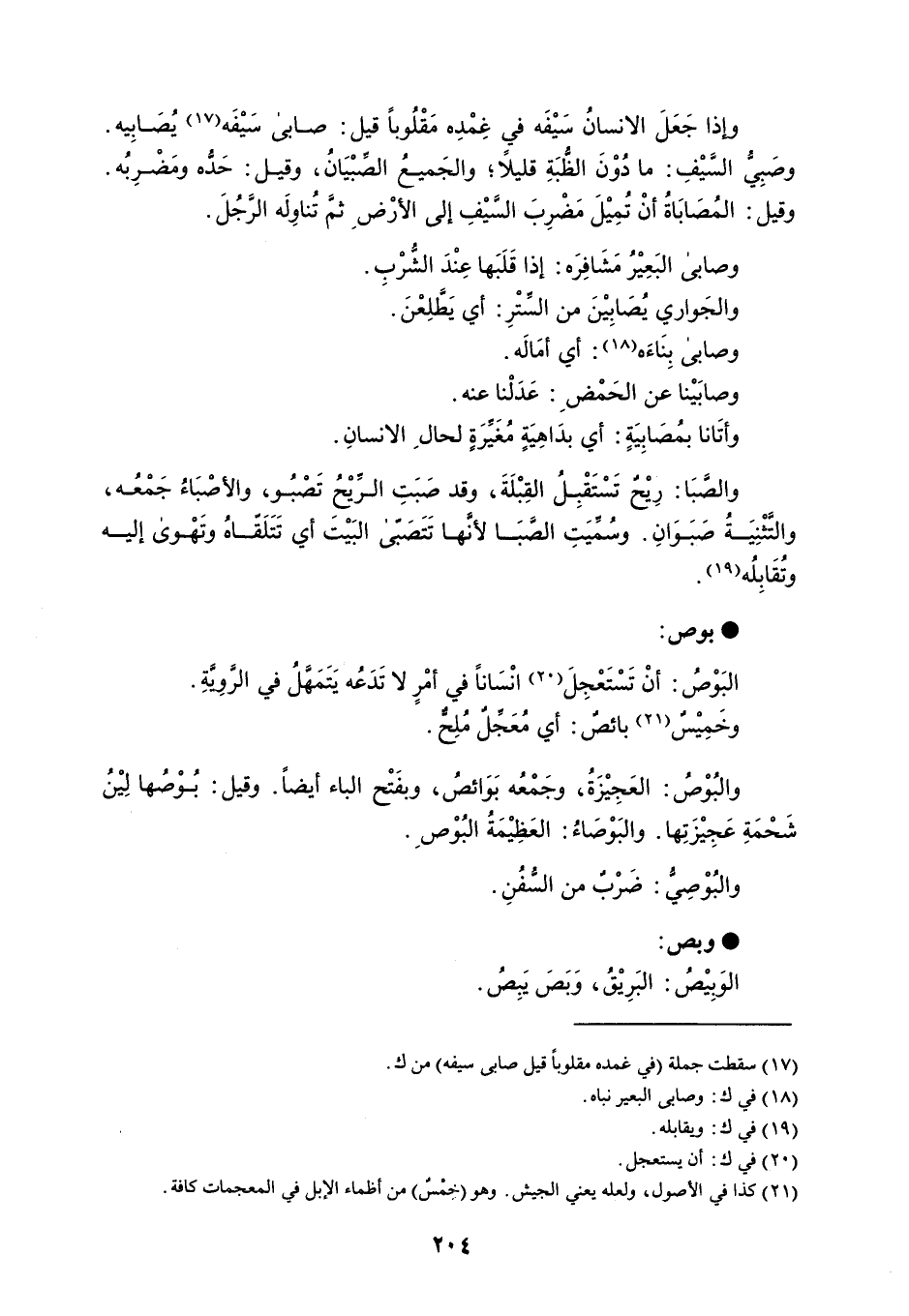 وإذا جَعَلَ الانسانُ سَيْفَه في غِمْدِه مَقْلُوباً قيل : صابى سَيْفَه يُصَابِيه . وصَبِي السيْفِ : ما دُوْنَ الظُبَةِ قليلاً ؛ والجَميعُ الصِّبْيَانُ ، وقيل : حَده ومَضْرِبُه . وقيل : المُصَابَاةُ أنْ تُمِيْلَ مَضْرِبَ السَّيْفِ إلى الأرْضِ ثم تُناوِلَه الرَّجُلَ . وصابى البَعِيْرُ مَشَافِرَه : إذا قَلَبَها عِنْدَ الشُرْبِ . والجَواري يصَابِيْنَ من السَتْرِ : أي يَطلِعْنَ . وصابى بِنَاءه : أي أمَالَه . وصابَيْنا عن الحَمْضِ : عَدَلْنا عنه . وأتَانا بمُصَابِيَةٍ : أي بدَاهِيَةٍ مُغَيرَةٍ لحالِ الانسانِ . والصبَا : رِيْحٌ تَسْتَقْبِلُ القِبْلَةَ ، وقد صَبَتِ الرِّيْحُ تَصْبُو ، والأصْبَاءُ جَمْعُه ، والتَثْنِيَةُ صَبَوَانِ . وسُمَيَتِ الصبَا لأنَّها تَتَصَبى البَيْتَ أي تَتَلَقّاهُ وتَهْوى إليه وتُقَابِلُه . بوص البَوْصُ : أنْ تَسْتَعْجِلَ انْسَاناً في أمْرٍ لا تَدَعُه يَتَمَهَّلُ في الروِّيةِ . وخَمِيْسٌ بائصٌ : أي مُعَجِّلٌ مُلِح . والبُوْصُ : العَجِيْزَةُ ، وجَمْعُه بَوَائصُ ، وبفَتْح الباء أيضاً . وقيل : بُوْصُها لِيْنُ شَحْمَةِ عَجِيْزَتِها . والبَوْصَاءُ : العَظِيْمَةُ البُوْصِ . والبُوْصِيُ : ضَرْب من السفُنِ . وبص الوَبِيْصُ : البَرِيْقُ ، وَبَصَ يَبِصُ .