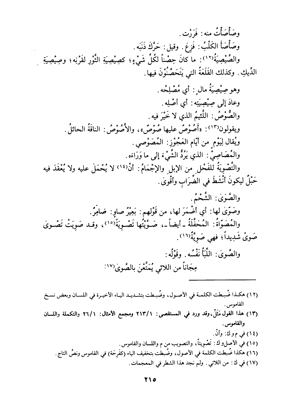 وصَأْصَأْتُ منه : فَرَرْت . وصَأْصأَ الكَلْبُ : فَزعَ . وقيل : حَركَ ذَنَبَه . والصيْصِيَةُ : ما كانَ حِصْناً لكُلِّ شَيْءٍ ؛ كصِيْصِيَةِ الثوْرِ لقَرْنِه ؛ وصِيْصِيَةِ الديكِ . وكذلك القَلَعَةُ التي يَتَحَصنُوْنَ فيها . وهو صِيْصِيَةُ مالٍ : أي مُصْلِحُه . وعادَ إلى صِيْصِيَتِه : أي أصْلِه . والصوْصُ : اللئيمُ الذي لا خَيْرَ فيه . ويقولون : ' أَصُوْصٌ عليها صُوْصٌ ' ، والأصُوْصُ : الناقَةُ الحائلُ . وُيقال لِيَوْمِ من أيّام العَجُوْزِ : المُصَوْصي . والمُصَاصِي : الذي يَرُدُّ الشيْءَ إلى ما وَرَاءه . والتَصْوِيَةُ للفَحْلِ من الإبلِ والإجْمَامُ : أنْ لا يُحْمَلَ عليه ولا يُعْقَدَ فيه حَبْل ليكونَ أنْشَطَ في الضَرَابِ وأقْوى . والصوَى : الشحْمُ . وصَوّى لها : أي أضْمَرَ لها ، من قَوْلهم : بَعِيْرٌ صاوٍ : ضامر . والمُصَواةُ : المُحَفلَةُ - أيضاً - ، صَويْتُها تَصْوِيَةً ، وقد صَوِيَتْ تَصْوى صَوى شَدِيداً ؛ فهي صَوِيةٌ . والصوى : اللبَأُ نَفْسُه . وقَوْلُه : مِجَاناً من اللائي يُمَتَّعْنَ بالصَّوى