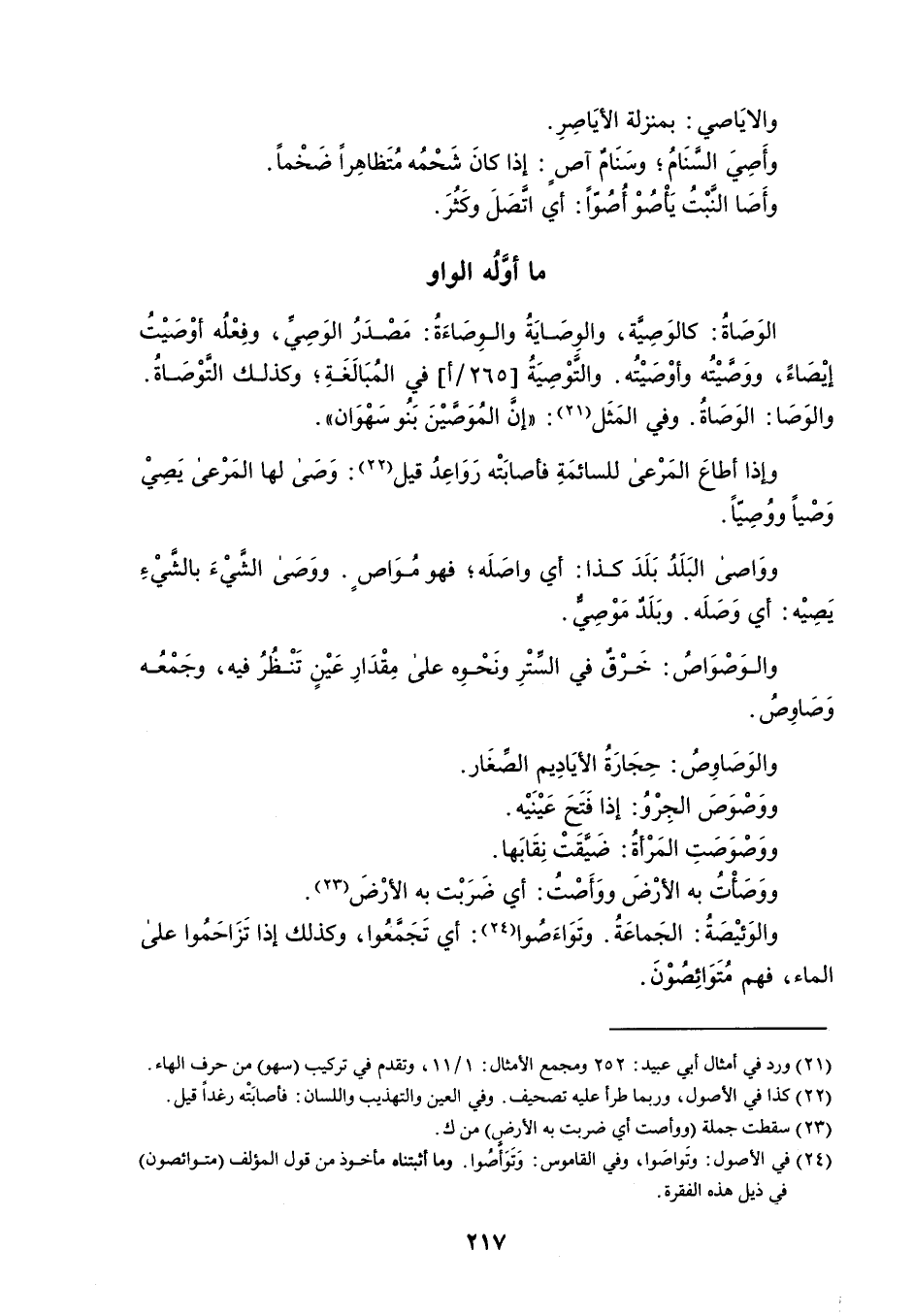 الوَصَاةُ : كالوَصِية ، والوِصَايَةُ والوِصَاءةُ : مَصْدَرُ الوَصِي ، وفِعْلُه أوْصَيْت إيْصَاءً ، ووَصيْتُه وأوْصَيْته . والتَوْصِيَةُ في المُبَالَغَةِ ؛ وكذلك التوْصَاةُ . والوَصَا : الوَصَاةُ . وفي المَثَل : ' إنَ المُوَصَيْنَ بَنُو سَهْوَان ' . وإذا أطاعَ المَرْعى للسائمَةِ فاصابَتْه رَوَاعِدُ قيل : وَصَى لها المَرْعى يَصِيْ وَصْياً ووُصِياً . ووَاصى البَلَدُ بَلَدَ كذا : أي واصَلَه ؛ فهو مُوَاص . ووَصَى الشيْءَ بالشَّيْءِ يَصِيْه : أي وَصَلَه . وبَلَد مَوْصِي . والوَصْوَاصُ : خَرْقٌ في السِّتْرِ ونَحْوِه على مِقْدَارِ عَيْنٍ تَنْظُرُ فيه ، وجَمْعُه وَصَاوِصُ . والوَصَاوِصُ : حِجَارَةُ الأيَادِيم الصِّغَار . ووَصْوَصَ الجِرْوُ : إذا فَتَحَ عَيْنَيْه . ووَصْوَصَتِ المَرْأةُ : ضَيَّقَتْ نِقَابَها . ووَصَاْتُ به الأرْضَ ووَأَصْتُ : أي ضَرَبْت به الأرْضَ . والوَئيْصَةُ : الجَماعَةُ . وتَوَاءَصُوا : أي تَجَمَّعُوا ، وكذلك إذا تَزَاحَمُوا على الماء ، فهم مُتَوَائِصُوْنَ .