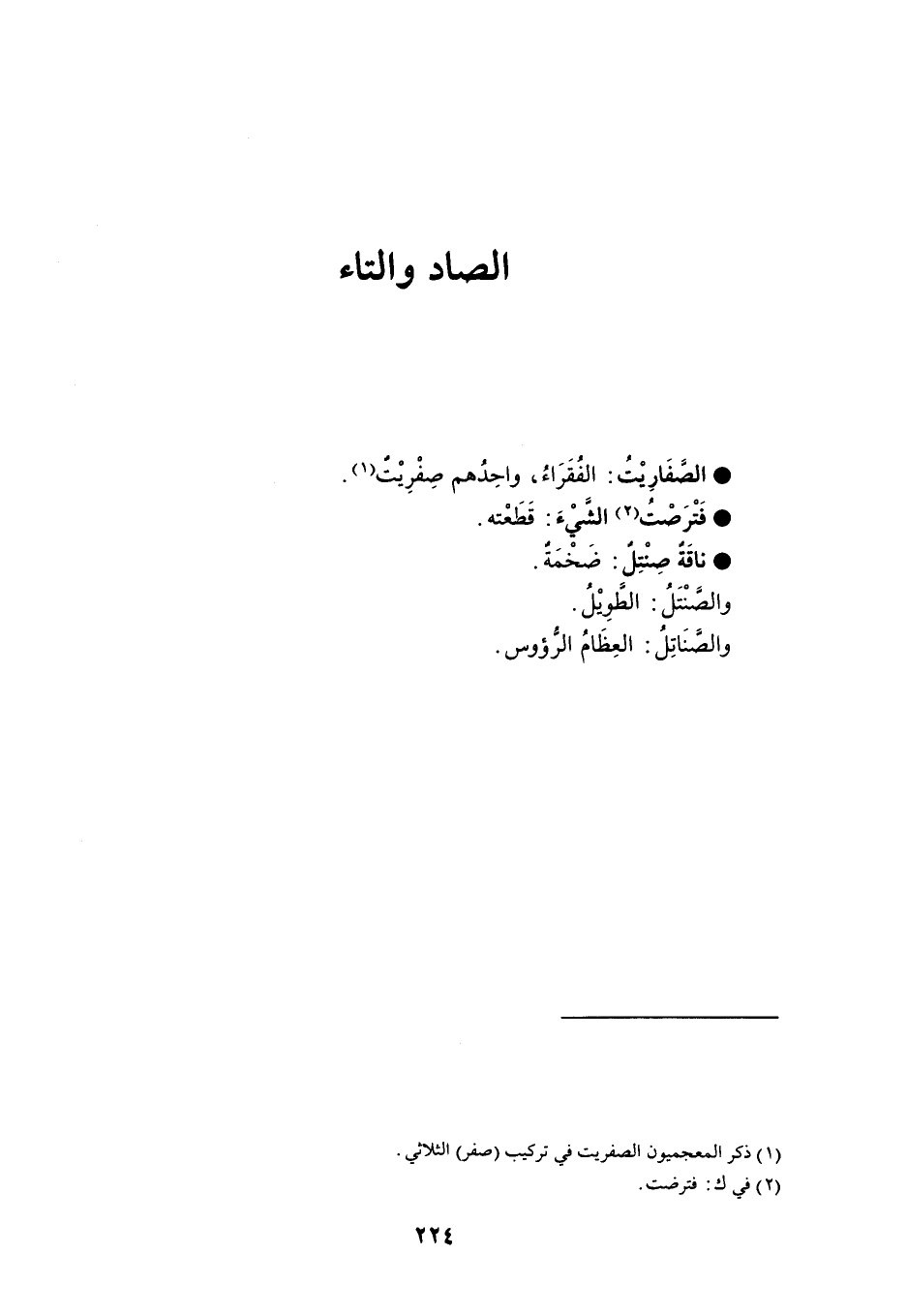 الصفَارِيْتُ الفُقَرَاءُ ، واحِدُهم صِفْرِيْت . فَتْرصتُ الشيْءَ اقَطعْته . ناقَة صِنْتِل ضَخمَة . والصنْتَلُ : الطوِيْلُ . والصنَاتِلُ : العِظَام الرؤوس .
