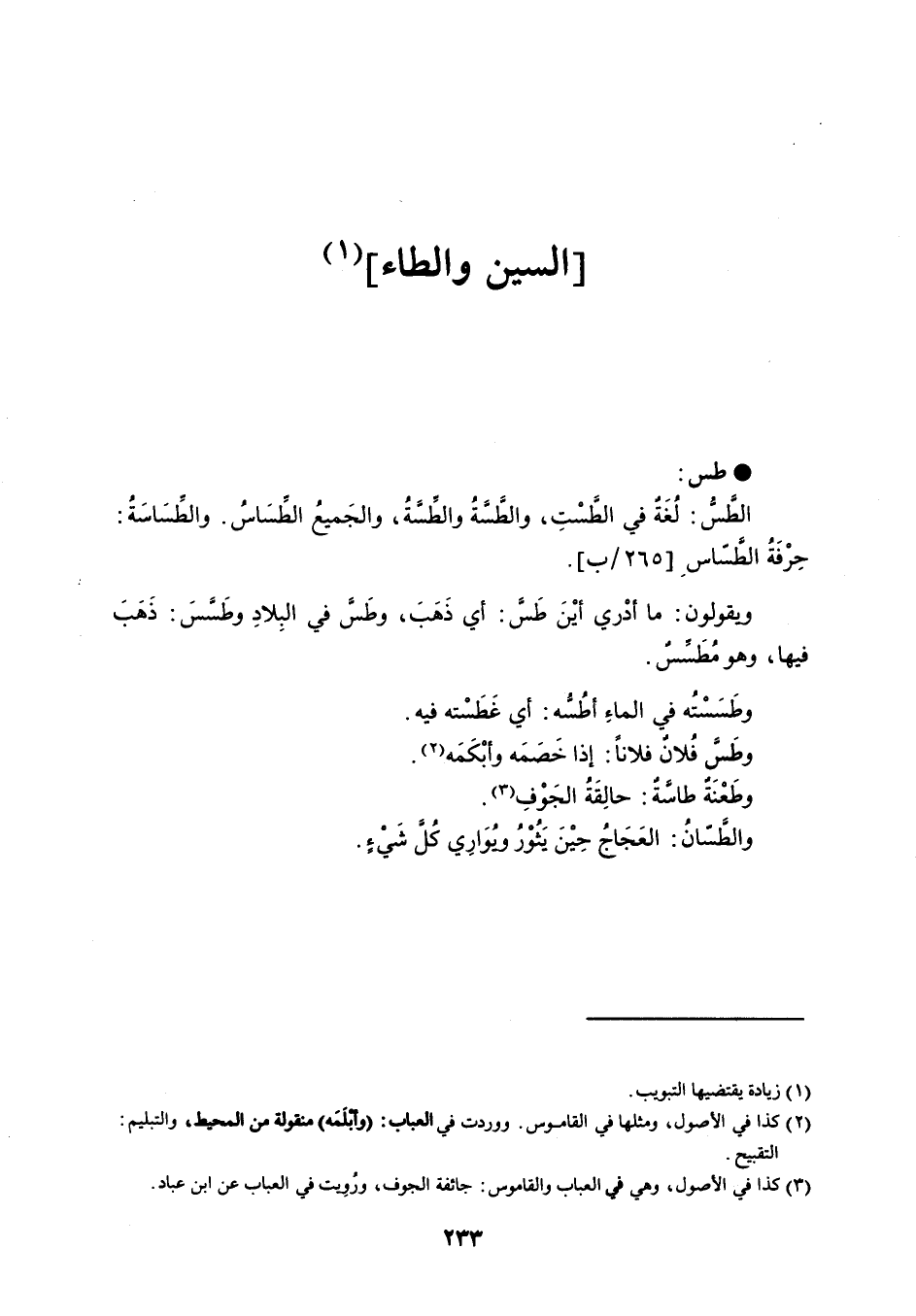 طس الطس : لُغَة في الطسْتِ ، والطَّسةُ والطِّسةُ ، والجَميعُ الطِّسَاسُ . والطِّسَاسَةُ : حِرْفَةُ الطَّساسِ . ويقولون : ما أدْري أيْنَ طَسَّ : أي ذَهَبَ ، وطَس في البِلادِ وطَسَّس : ذَهَبَ فيها ، وهو مُطسِّس . وطَسَسْتُه في الماءِ أطُسه : أي غَطَسْته فيه . وطَس فُلان فلاناً : إذا خَصَمَه وأبْكَمَه . وطَعْنَةٌ طاسة : حالِقَةُ الجَوْفِ . والطسانُ : العَجَاجُ حِيْنَ يَثُوْرُ وُيوَارِي كُل شَيْءٍ .