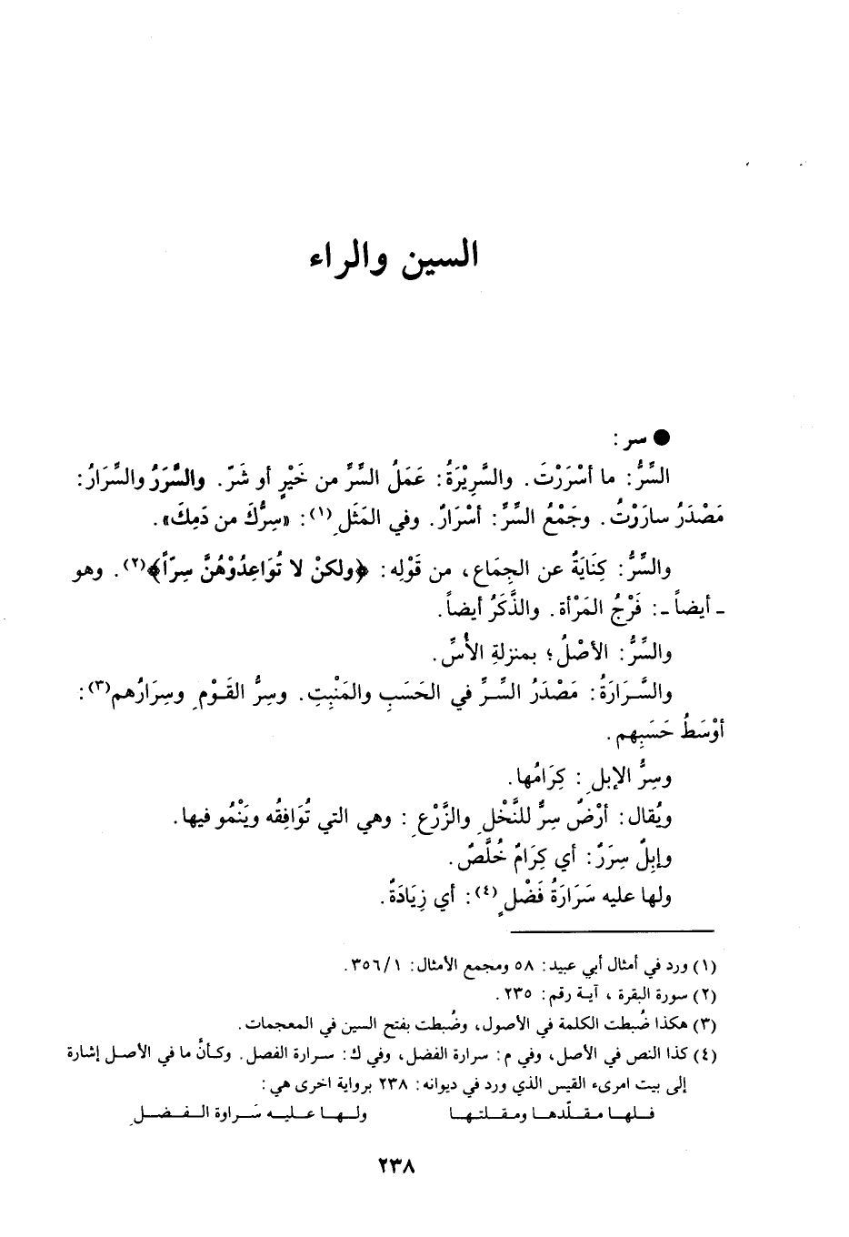 سر السرُ : ما أسْرَرْتَ . والسرِيْرَة : عَمَلُ السر من خَيْرٍ أو شَر . والسرَرُ والسِّرَارُ : مَصْدَرُ سارَرْتُ . وجَمْع السر : أسْرَارَ . وفي المَثَلِ : ' سِركَ من دَمِكَ ' . والسرُ : كِنَايَة عن الجِمَاع ، من قَوْلِه : ' ولكنْ لا تُوَاعِدُوْهُنَّ سِراً ' . وهو - أيضاً - : فَرْجُ المَرْأة . والذَكَر أيضاً . والسرُ : الأصْلُ ؛ بمنزلةِ الأس . والسرَارَةُ : مَصْدَرُ السر في الحَسَبِ والمَنْبِتِ . وسِر القَوْمِ وسِرَارُهم : أوْسَطُ حَسَبِهم . وسِرُ الإبلِ : كِرَامُها . وُيقال : أرْض سِر للنَخْلِِ والزرْعِ : وهي التي تُوَافِقُه وَينْمُو فيها . وإبِلٌ سِرَر : أي كِرَام خُلَص . ولها عليه سَرَارَةُ فَضْلٍ : أي زِيَادَةٌ .