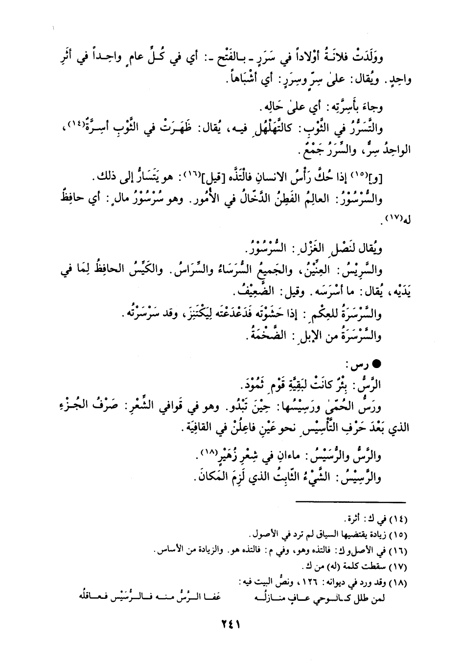 ووَلَدَتْ فلانَةُ أوْلاداً في سَرَرٍ - بالفَتْح - : أي في كُل عامٍ واحِداً في أثَرِ واحِدٍ . ويُقال : على سِر وسِرَرٍ : أي أشْبَاهاً . وجاءَ بأسِرتِه : أي على حَالِه . والتَسَرُرُ في الثوْب : كالتهَلْهُلِ فيه ، يُقال : ظَهَرَتْ في الثَّوْبِ أسِرةٌ ، الواحِدُ سِر ، والسرَرُ جَمْع . و إذا حُك رَأْسُ الانسانِ فالْتَذَه قيل : هو يَتَسَار إلى ذلك . والسرْسُوْرُ : العالِمُ الفَطِنُ الدخالُ في الأمُور . وهو سُرْسُوْرُ مالٍ : أي حافِظ له . وُيقال لنَصْلِ الغَزْلِ : السُرْسُوْرُ . والسرِيْسُ : العِنيْنُ ، والجَميعُ السُرَسَاءُ والسرَاسُ . والكَيسُ الحافِظُ لِمَا في يَدَيْه ، يُقال : ما أسرَسَه . وقيل : الضعِيْفُ . والسرْسَرَةُ للعِكْمِ : إذا حَشَوْتَه فَدَعْدَعْتَه لِيَكْتَنِزَ ، وقد سرْسَرْتُه . والسرْسَرَةُ من الإبلِ : الضخمَةُ . رس الرس : بِئْر كانَتْ لبَقِيةِ قَوْمِ ثَمُوْدَ . ورَس الحُمى ورَسيسُها : حِين تَبْدُو . وهو في قَوافي الشعْرِ : صَرْفُ الجُزْءِ الذي بَعدَ حَرفِ التأسيس نحو عَيْنِ فاعِلُنْ في القافِيَة . والرس والرسيس : ماءانِ في شِعْرِ زُهَيرٍ . والرسيس : الشيء الثابت الدي لزم المكان .