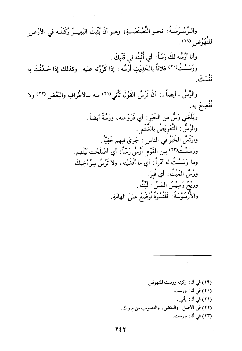 والرسْرَسسَةُ : نحو النَّصْنَصَةِ ؛ وهو أنْ يُثْبِتَ البَعِيرُ رُكْبَتَه في الأرْضِ للنهُوْضِ . وأنا أرُسه لكَ رَساً : أي أُثْبِتُه في قَلْبِكَ . ورَسَسْتُ فلاناً بالحَدِيْثِ أَرُسُه : إذا كَررْته عليه . وكذلك إذا حَدثْتَ به نَفْسَكَ . والرَّس - أيضاً - : أنْ تَرُس القَوْلَ تَأتي منه بالأطْرافِ والبَعْضِ ولا تُفْصِحَ به . وبَلغَني رَس من الخَبَرِ : أي ذَرْو منه ، ورَسةٌ أيضاً . والرس : التَعْرِيْضُ بالشتمِ . وارْتَس الخَبَرُ في الناسِ : جَرى فيهم خَفِياً . ورَسسَت بين القَوْمِ أَرُس رَساً : أي أصْلَحْت بَيْنَهم . وما رَسَسْتُ له أمْراً : أي ما أفْشَيْته ، ولا تَرُس سِر أخِيكَ . ورُس المَيتُ : أي قُبِرَ . ورِبْحٌ رَسِيْسُ المَس : لَينَتُه . والارسُوْسَةُ : قَلَنْسُوَةٌ تُوْضَعُ على الهامَةِ .