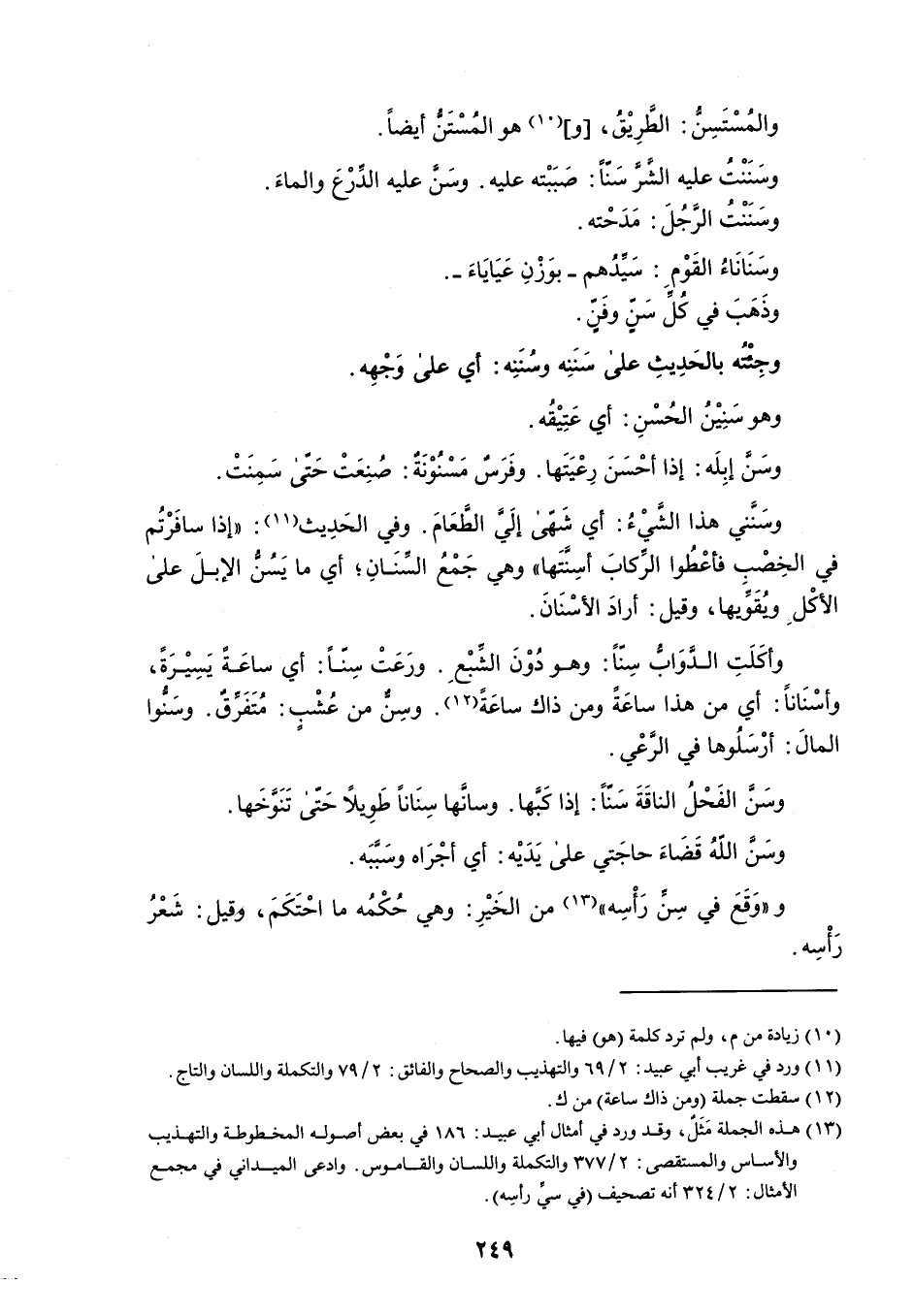 والمُسْتَسِنُ : الطرِيْقُ ، و هو المُسْتَنُّ أيضاً . وسَنَنْتُ عليه الشرسَنّاً : صَبَبْته عليه . وسَنَ عليه الدرْعَ والماءَ . وسَنَنْتُ الرجُلَ : مَدَحْته . وسَنَانَاءُ القَوْمِ : سَيدُهم - بوَزْنِ عَيَايَاءَ - . وذَهَبَ في كُل سَن وفَنٍ . وجِئته بالحَدِيثِ على سَنَنِه وسُنَنِه : أي على وَجْهِه . وهو سَنِيْنُ الحُسْنِ : أي عَتِيْقُه . وسَن إبِلَه : إذا أحْسَنَ رِعْيَتَها . وفَرَس مَسْنُوْنَة : صُنِعَتْ حَتّى سَمِنَتْ . وسَنَني هذا الشيْءُ ؛ أي شَهّى إلَيَّ الطعَامَ . وفي الحَدِيث : ' إذا سافَرْتُم في الخِصْب فاعْطُوا الركابَ أسِنتَها ' وهي جَمْعُ السِّنَانِ ؛ أي ما يَسُنُّ الإبلَ على الأكْلِ وُيقَويها ، وقيل : أرادَ الأسْنَانَ . وأكَلَتِ الدَّوَابُّ سِنّاً : وهو دُوْنَ الشبْعِ . ورَعَتْ سِنّاً : أي ساعَةً يَسِيْرَةً ، وأسْنَاناً : أي من هذا ساعَةً ومن ذاك ساعَةً . وسِن من عُشْبٍ : مُتَفَرقٌ . وسَنّوا المالَ : أرْسَلُوها في الرعْي . وسَنَ الفَحْلُ الناقَةَ سَنّاً : إذا كَبها . وسانها سِنَاناً طَوِيلاً حَتّى تَنَوَّخَها . وسَنَ اللّهُ قَضَاءَ حاجَتي على يَدَيْه : أي أجْرَاه وسَبَّبَه . و ' وَقَعَ في سِنَ رَأْسِه ' من الخَيْرِ : وهي حُكْمُه ما احْتَكَمَ ، وقيل : شَعْرُ رَأْسِه .
