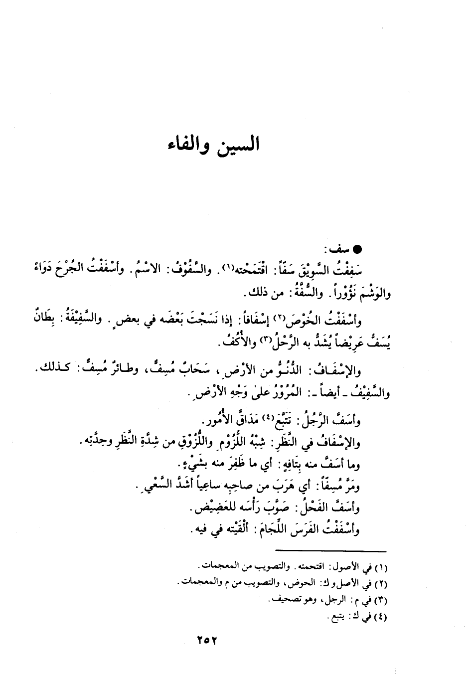 سف سَفِفْتُ السويقَ سَفاً : اقْتَمَحْته . والسفُوْفُ : الاسْمُ . وأسْفَفْتُ الجُرْحَ دَوَاء والوَشْمَ نَؤُوْراً . والسُّفَةُ : من ذلك . وأسْفَفْتُ الخُوْصَ إسْفَافاً : إذا نَسَجْتَ بَعْضَه في بعضٍ . والسفِيْفَةُ : بِطَان يُسَفُ عَرِيْضاً يُشَدُّ به الرحْلُ والأكُفُ . والإسْفَافُ : الدنُو من الأرْضِ ، سَحَابٌ مُسِف ، وطائر مُسِف : كذلك . والسفِيْفُ - أيضاً - : المُرُوْرُ على وَجهِ الأرْضِ . وأسَفَ الرجُلُ : تَتَبعَ مَدَاق الأمُور . والإسْفَافُ في النظَرِ : شِبْهُ اللُّزُوْمِ واللزُوْقِ من شِدةِ النَظَرِ وحِدتِه . وما أسَفَ منه بِتَافِه : أي ما ظَفِرَ منه بشَيْءٍ . ومَر مُسِفاً : أي هَرَبَ من صاحِبِه ساعِياً أشَد السعْيِ . وأسَف الفَحْلُ : صَوبَ رَأسَه للعَضِيْض . وأسْفَفْتُ الفَرَسَ اللجَامَ : ألْقَيْته في فيه .