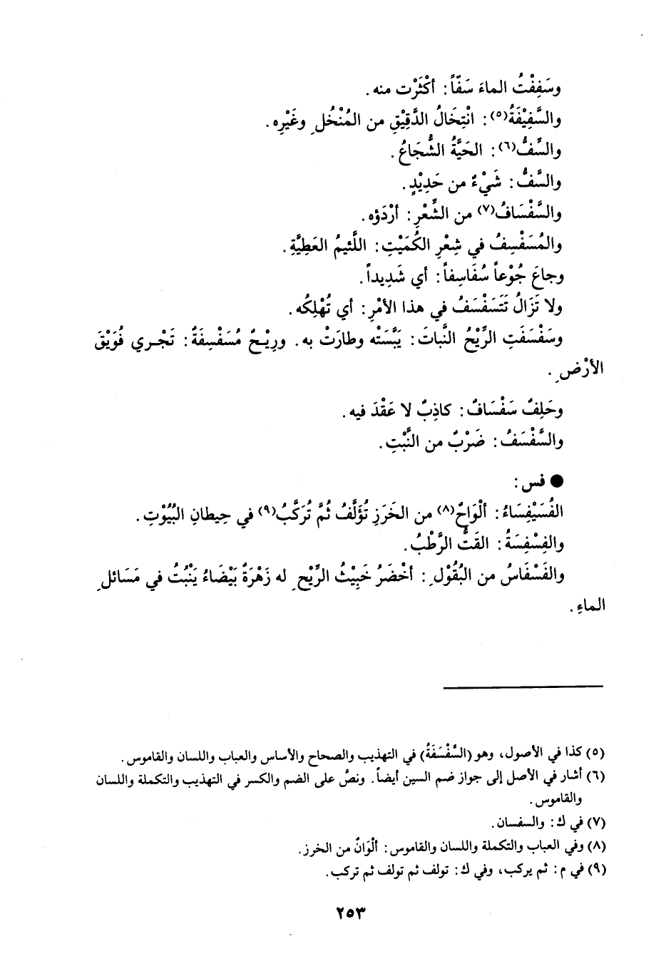 وسَفِفْتُ الماءَ سَفاً : أكْثَرْت منه . والسفِيْفَةُ : انْتِخَالُ الدقيْقِ من المُنْخُلِ وغَيْرِه . والسف : الحَيةُ الشجَاعُ . والسفُّ : شَيْء من حَدِيْدٍ . والسفْسَافُ من الشعْرِ : أرْدَؤه . والمُسَفْسِفُ في شِعْرِ الكُمَيتِ : اللئيمُ العَطِيةِ . وجاعَ جُوْعاً سُفَاسِفاً : أي شَدِيداً . ولا تَزَالُ تَتَسَفْسَفُ في هذا الأمْرِ : أي تُهْلِكُه . وسَفْسَفَتِ الريْحُ النَباتَ : يَبسَتْه وطارَت به . ورِيْحٌ مُسَفْسِفَة : تَجْري فُوَيْقَ الأرْضَ . وحَلِفٌ سَفْسَاف : كاذِبٌ لا عَقْدَ فيه . والسفْسَفُ : ضَرْبٌ من النبْتِ . فس الفُسَيْفِسَاءُ : ألْوَح من الخَرَزِ تُؤَلفُ ثُم تُرَكبُ في حِيطانِ البُيُوْتِ . والفِسْفِسَةُ : القَت الرَّطْبُ . والفَسْفَاسُ من البُقُوْلِ : أخْضَرُ خَبِيْثُ الريْحِ له زَهْرَةٌ بَيْضَاءُ يَنْبُتُ في مَسَائل الماءِ .