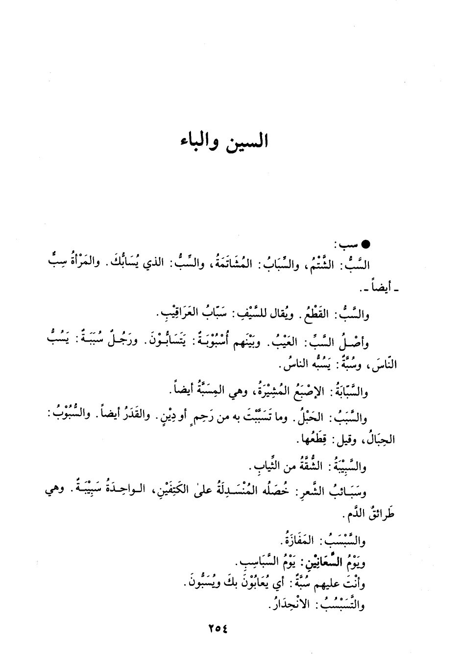 سب السبب : الشتْمُ ، والسبَابُ : المُشَاتَمَةُ ، والسب : الذي يُسَابُكَ . والمَرْأةُ سِب - أيضاً - . والسبُ : القَطْعُ . وُيقال للسيْفِ : سَبابُ العَرَاقِيْبِ . وأصْلُ السب : العَيْبُ . وبَيْنَهم أُسْبُوْبَةٌ : يَتَسَابُّوْنَ . ورَجُلٌ سُبَبَةٌ : يَسُب الناسَ ، وسُبة : يَسُبه الناسُ . والسبابَةُ : الإصْبَعُ المُشِيْرَةُ ، وهي المِسَبةُ أيضاً . والسبَبُ : الحَبْلُ . وما تَسَبَّبْتَ به من رَحِمٍ أو دِيْنٍ . والقَدَرُ أيضاً . والسُبُوْبُ : الحِبَالُ ، وقيل : قِطَعُها . والسبِيْبَةُ : الشقةُ من الثيابِ . وسَبَائبُ الشعرِ : خُصَلُه المُنْسَدِلَةُ على الكَتِفَيْنِ ، الواحِدَةُ سَبِيْبَةٌ . وهي طَرائقُ الدم . والسبْسَبُ : المَفَازَةُ . ويَوْمُ السعَانين : يَوْمُ السَّبَاسبٍ . وأنْتَ عليهم سُبة : أي يُعَابُوْنَ بكَ وُيسَبُّونَ . والتَّسَبْسُبُ : الانْحِدَارُ .