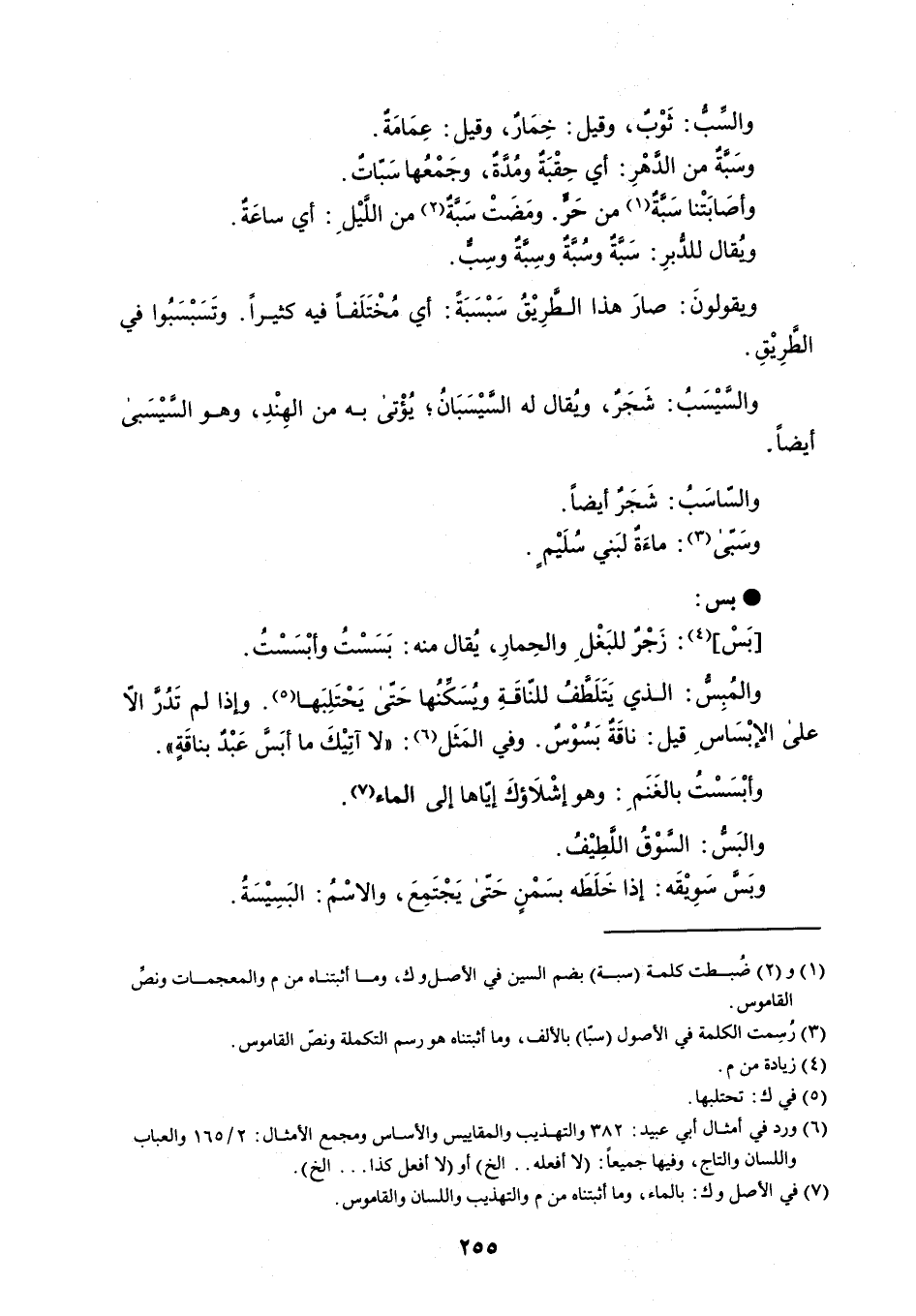 والسب : ثَوْبٌ ، وقيل : خِمَارٌ ، وقيل : عِمَامَةٌ . وسَبةٌ من الدهْرِ : أي حِقْبَةٌ ومُدَّة ، وجَمْعُها سَباتٌ . وأصَابَتْنا سَبة من حَر . ومَضَتْ سَبة من النَيْلِ : أي ساعَة . وُيقال للدبرِ : سَبة وسُبة وسِبةٌ وسِبٌّ . ويقولونَ : صارَ هذا الطرِيْقُ سَبْسَبَةً : أي مُخْتَلَفاً فيه كثيراً . وتَسَبْسَبُوا في الطرِيْقِ . والسيْسَبُ : شَجَرَ ، وُيقال له السيْسَبَانُ ؛ يُؤْتى به من الهِنْدِ ، وهو السيْسَبى أيضاً . والساسبُ : شَجَرٌ أيضاً . وسَبى : ماءةٌ لبَني سلَيْمٍ . بس أبَسْ : زَجْر للبَغْلِ والحِمارِ ، يُقال منه : بَسَسْتُ وأبْسَسْتُ . والمُبِس : الذي يَتَلَطفُ للناقَةِ ويُسكنُها حَتى يَحْتَلِبَها . وإذا لم تَدُر الا على الإبْسَاسِ قيل : ناقَة بَسُوْسٌ . وفي المَثَل : ' لا آتِيْكَ ما أبس عَبْد بناقَةٍ ' . وأبْسَسْتُ بالغَنَمِ : وهو إشْلاَؤكَ إياها إلى الماء . والبَس : السوْقُ اللطِيْفُ . وبَس سَوِيْقَه : إذا خَلَطَه بسَمْنٍ حَتّى يَجْتَمِعَ ، والاسْمُ : البَسِيْسَةُ .