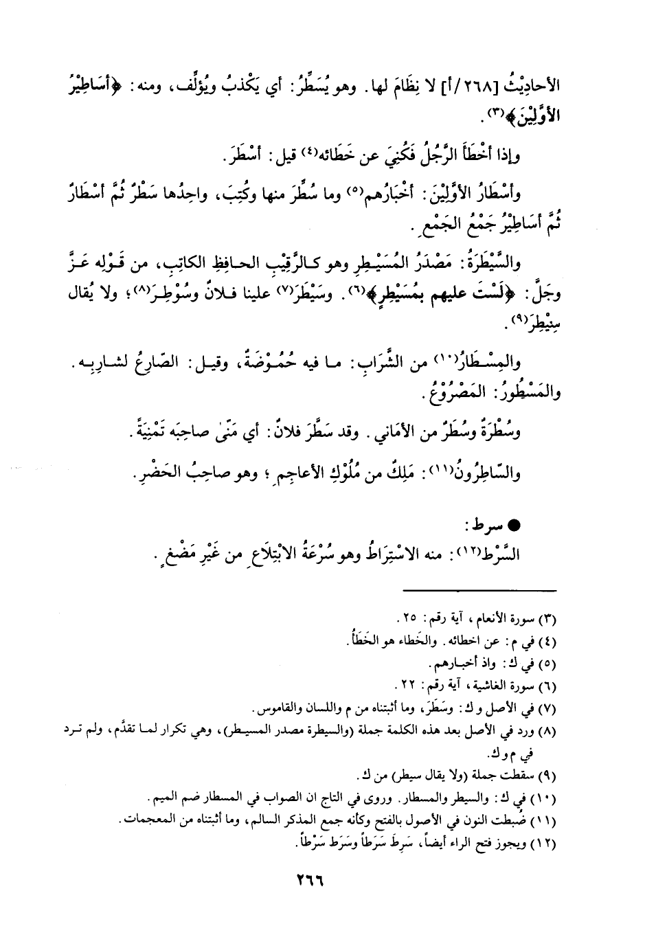 الأحادِيْثُ لا نِظَامَ لها . وهو يُسَطرُ : أي يَكْذبُ وُيؤلف ، ومنه : ' أسَاطِيْر الأولِيْنَ ' . وإذا أخْطَأ الرجُلُ فَكُنِيَ عن خَطَائه قيل : أسْطَرَ . وأسْطَارُ الأوليْنَ : أخْبَارُهم وما سُطِّرَ منها وكُتِبَ ، واحِدُها سَطْرٌ ثُمَّ أسْطَارٌ ثُم أسَاطِيْرُ جَمْعُ الجَمْعِ . والسيْطَرَةُ : مَصْدَرُ المُسَيْطِرِ وهو كالرَّقِيْبِ الحافِظِ الكاتِبِ ، من قَوْلِه عَزَ وجَل : ' لست عليهم بمُسَيْطِرٍ ' . وسَيْطَرَ علينا فلانٌ وسُوْطِرَ ؛ ولا يُقال سنيْطِرَ . والمِسْطَارُ من الشرَابِ : ما فيه حُمُوْضَةٌ ، وقيل : الصّارِعُ لشارِبِه . والمَسْطور : المَصْرُوْعُ . وسُطْرَةٌ وسُطَرٌ من الأمَاني . وقد سَطَّرَ فلان : أي مَنى صاحِبَه تَمْنِيَةً . والساطِرُونُ : مَلِكٌ من مُلُوْكِ الأعاجِمِ ؛ وهو صاحِبُ الحَضْرِ . سرط السرْط : منه الاسْتِرَاطُ وهو سُرْعَةُ الابْتِلَاعِ من غَيْرِ مَضْغٍ .