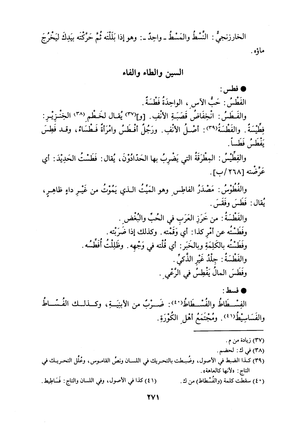 فطس الفَطْسُ : حَب الآسِ ، الواحِدَةُ فَطْسَة . والفَطَسُ : انْخِفَاضُ قَصَبَةِ الأنْفِ . و يُقال لخَطْمِ الخِنْزِيْرِ : فِطيْسَةٌ . والفَطْسَةُ : أصْلُ الأنْفِ . ورَجُلٌ أفْطَسُ وامْرَأةٌ فَطْسَاءُ ، وقد فَطِسَ يَفْطَسُ فَطَساً . والفِطِّيْسُ : المِطْرَقَةُ التي يَضْرِبُ بها الحَدّادُوْنَ ، يُقال : فَطَسْتُ الحَدِيْدَ : أي عَرضْته . والفُطُوْسُ : مَصْدَرُ الفاطِسِ وهو المَيِّتُ الذي يَمُوْتُ من غَيْرِ داءٍ ظاهِرٍ ، يُقال : فَطَسَ وفَقَسَ . والفَطْسَةُ : من خَرَزِ العَرَبِ في الحُبِّ والبُغْضِ . وفَطَسْتُه عن أمْرِ كذا : أي وَقَمْته . وكذلك إذا ضَرَبْته . وفَطَسْتُه بالكَلِمَةِ وبالخَبَر : أي قُلْته في وَجْهِه . وظَلِلْتُ أُفَطسُه . والفَطْسَةُ : جِلْدُ غَيْرِ الذَّكيِّ . وفَطَسَ المالُ يَفْطِسُ في الرَّعْيِ . فسط الفِسْطَاطُ والفُسْطَاطُ : ضَرْبٌ من الأبنِيَةِ ، وكذلك الفُسّاطُ والفَسَاسِيْطُ . ومُجْتَمَعُ أهْلِ الكُوْرَةِ .