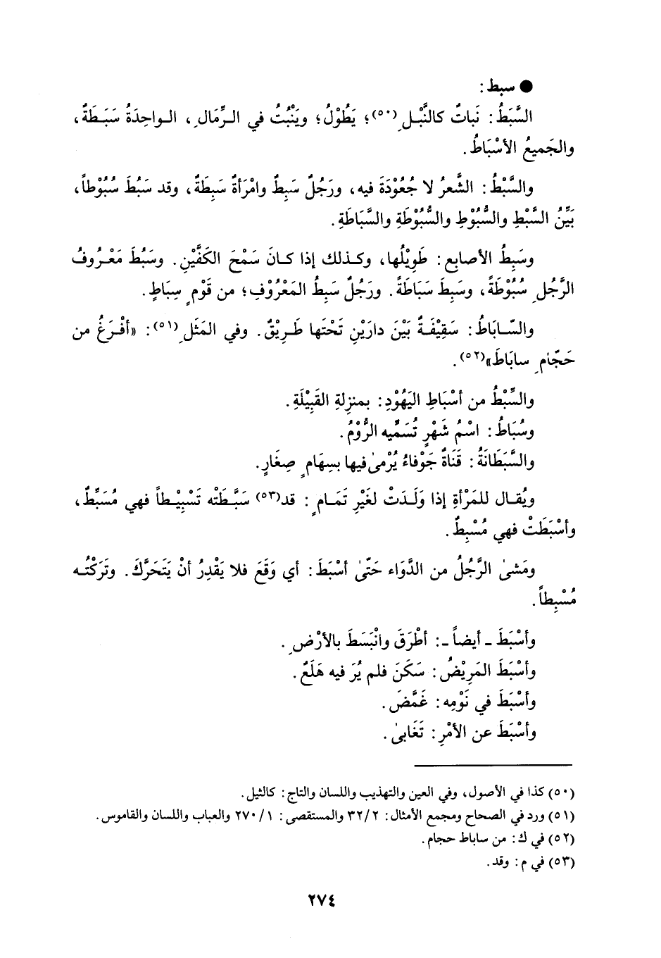 سبط السَّبَطُ : نَباتٌ كالنبْلِ ؛ يَطُوْلُ ؛ وَينْبُتُ فى الرمَالِ ، الواحِدَةُ سَبَطَةٌ ، والجَميعُ الأسْبَاطُ . والسبْطُ : الشعرُ لا جُعُوْدَةَ فيه ، ورَجُلٌ سَبِط وامْرَأة سَبِطَةٌ ، وقد سَبُطَ سُبُوْطاً ، بَينُ السبْطِ والسُبُوْطِ والسُّبُوْطَةِ والسَّبَاطَةِ . وسَبِطُ الأصابع : طَوِيْلُها ، وكذلك إذا كانَ سَمْحَ الكَفَّيْنِ . وسَبُطَ مَعْرُوفُ الرجُلِ سُبُوْطَةً ، وسَبِطَ سَبَاطَةً . ورَجُلٌ سَبِطُ المَعْرُوْفِ ؛ من قَوْمٍ سِبَاطٍ . والسّابَاطُ : سَقِيْفَةٌ بَيْنَ دارَيْنِ تَحْتَها طَرِيْقٌ . وفي المَثَلِ : ' أفْرَغُ من حَجام سابَاطَ ' . والسبْطُ من أسْبَاطِ اليَهُوْدِ : بمنزِلةِ القَبِيْلةِ . وسُبَاطُ : اسْمُ شَهْرٍ تُسَميه الرُّوْمُ . والسبَطَانَةُ : قَنَاةٌ جَوْفاءُ يُرْمى فيها بسِهَامٍ صِغَارٍ . ويُقال للمَرْأةِ إذا وَلَدَتْ لغَيْرِ تَمَام : قد سَبَّطَتْه تَسْبِيْطاً فهي مُسَبطٌ ، وأسْبَطَتْ فهي مُسْبِطٌ . ً ومَشى الرجُلُ من الدَّوَاء حَتّى أسْبَطَ : أي وَقَعَ فلا يَقْدِرُ أنْ يَتَحَرَّكَ . وتَرَكْتُه مُسْبِطاً . وأسْبَطَ - أيضاً - : أطْرَقَ وانْبَسَطَ بالأرْضِ . وأسْبَطَ المَريضُ : سَكَنَ فلم يُرَ فيه هَلَع . وأسْبَطَ في نوْمِه : غَمضَ . وأسْبَطَ عن الأمْرِ : تَغَابى .