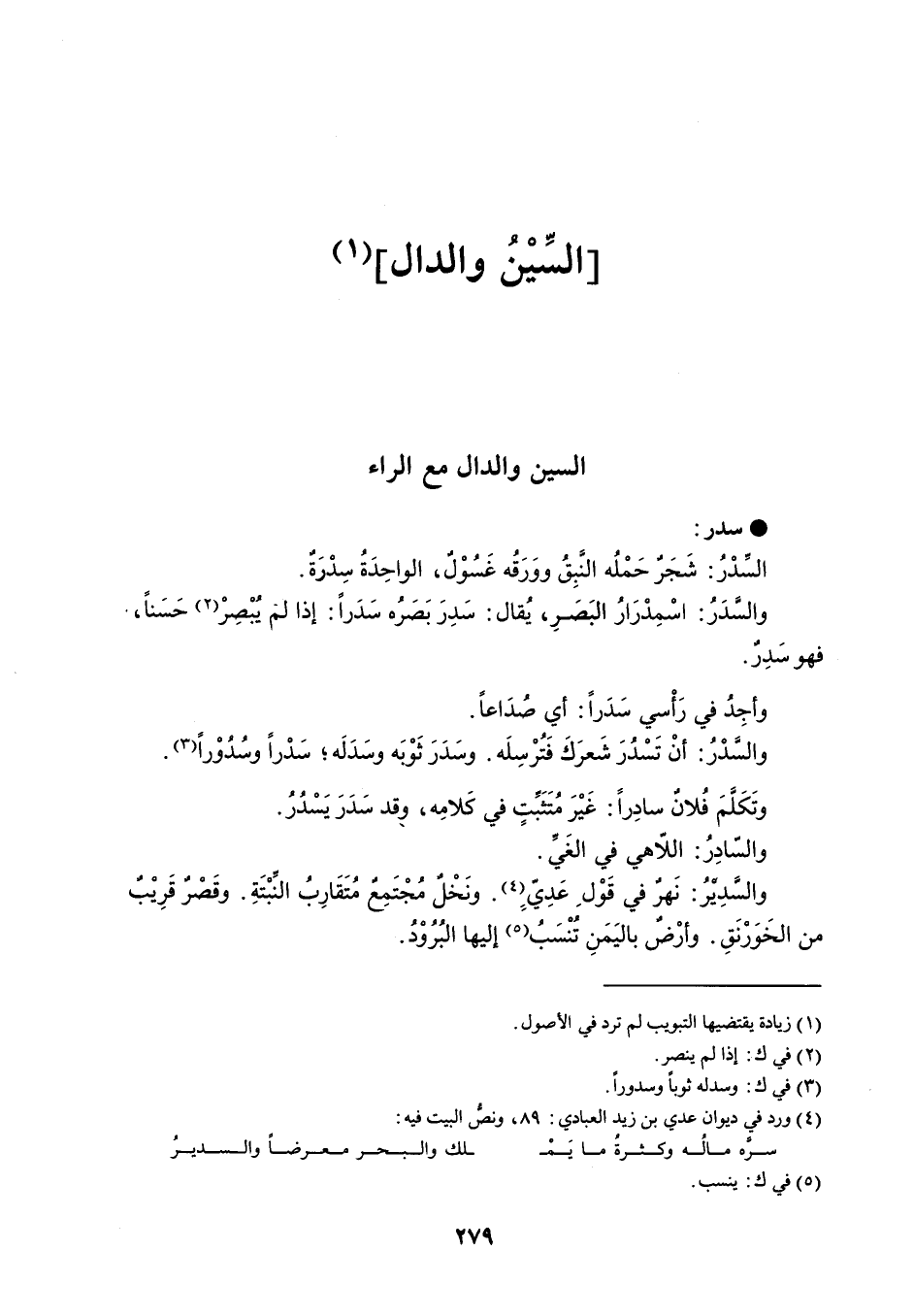 سدر السدْرُ : شَجَرٌ حَمْلُه النَّبِقُ ووَرَقُه غَسُوْلٌ ، الواحِدَةُ سِدْرَةٌ . والسدَرُ : اسْمِدْرَارُ البَصَرِ ، يُقال : سَدِرَ بَصَرُه سَدَراً : إذا لم يُبْصِرْ حَسَناً ، فهو سَدِرٌ . وأجِدُ في رَأْسي سَدَراً : أي صُدَاعاً . والسدْرُ : أنْ تَسْدُرَ شَعرَكَ فَتُرْسِلَه . وسَدَرَ ثَوْبَه وسَدَلَه ؛ سَدْراً وسُدُوْراً . وتَكَلَّمَ فُلانٌ سادِراً : غَيْرَ مُتَثَبِّتٍ في كَلامِه ، وقد سَدَرَ يَسْدُرُ . والسّادِرُ : اللّاهي في الغَيِّ . والسدِيرُ : نَهرٌ في قَوْلِ عَدِي . ونَخْل مُجْتَمِعٌ مُتَقَارِبُ النِّبْتَةِ . وقَصْر قَرِيْبٌ من الخَوَرْنَقِ . وأرْضٌ باليَمَنِ تُنْسَبُ إليها البُرُوْدُ .