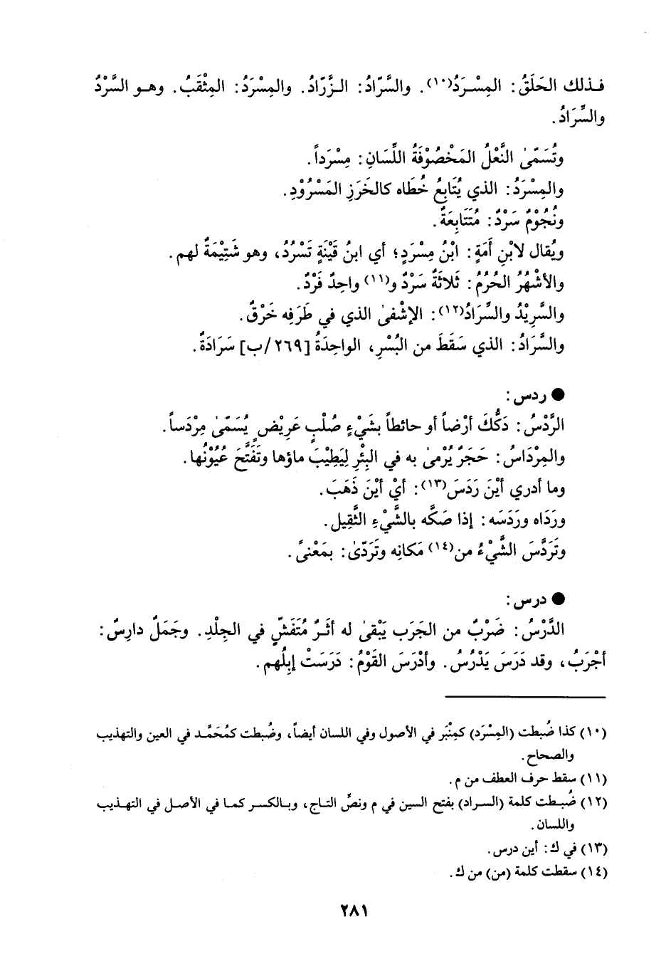 فذلك الحَلَقُ : المِسْرَدُ . والسرادُ : الزرّادُ . والمِسْرَدُ : المِثْقَبُ . وهو السرْدُ والسرَادُ . وتُسَمى النعْلُ المَخْصُوْفَةُ اللِّسَانِ : مِسْرَداً . والمِسْرَدُ : الذي يُتَابع خُطَاه كالخَرَزِ المَسْرُوْدِ . ونُجُوْمٌ سَرْد : مُتَتَابِعَة . وُيقال لابْنِ أَمَةٍ : ابْنُ مِسْرَدٍ ؛ أي ابنُ قَيْنَةٍ تَسْرُدُ ، وهو شَتِيْمَةٌ لهم . والأشْهُرُ الحُرُمُ : ثَلاثَةٌ سَرْد و واحِدٌ فَرْد . والسرِيْدُ والسرَادُ : الإشْفى الذي في طَرَفِه خَرْقٌ . والسرَادُ : الذي سَقَطَ من البُسْرِ ، الواحِدَةُ سَرَادَةٌ . ردس الردْسُ : دَكُّكَ أرْضاً أو حائطاً بشَيْءٍ صُلْب عَرِيْض يُسَمّى مِرْدَساً . والمِرْدَاسُ : حَجَرٌ يُرْمى به في البِئْرِ لِيَطِيْب ماؤها وتَفتَّحَ عُيُوْنُها . وما أدري أيْنَ رَدَسَ : أيْ أيْنَ ذَهَبَ . ورَدَاه ورَدَسَه : إذا صَكه بالشيْءِ الثَّقِيل . وتَرَدسَ الشيْءُ من مَكانِه وتَرَدّى : بمَعْنىً . درس الدرْسُ : ضَرْب من الجَرَب يَبْقى له أثَر مُتَفَشّ في الجِلْدِ . وجَمَلٌ دارِسٌ : أجْرَبُ ، وقد دَرَسَ يَدْرُسُ . وأدْرَسَ القَوْمُ : دَرَست إبِلُهم .