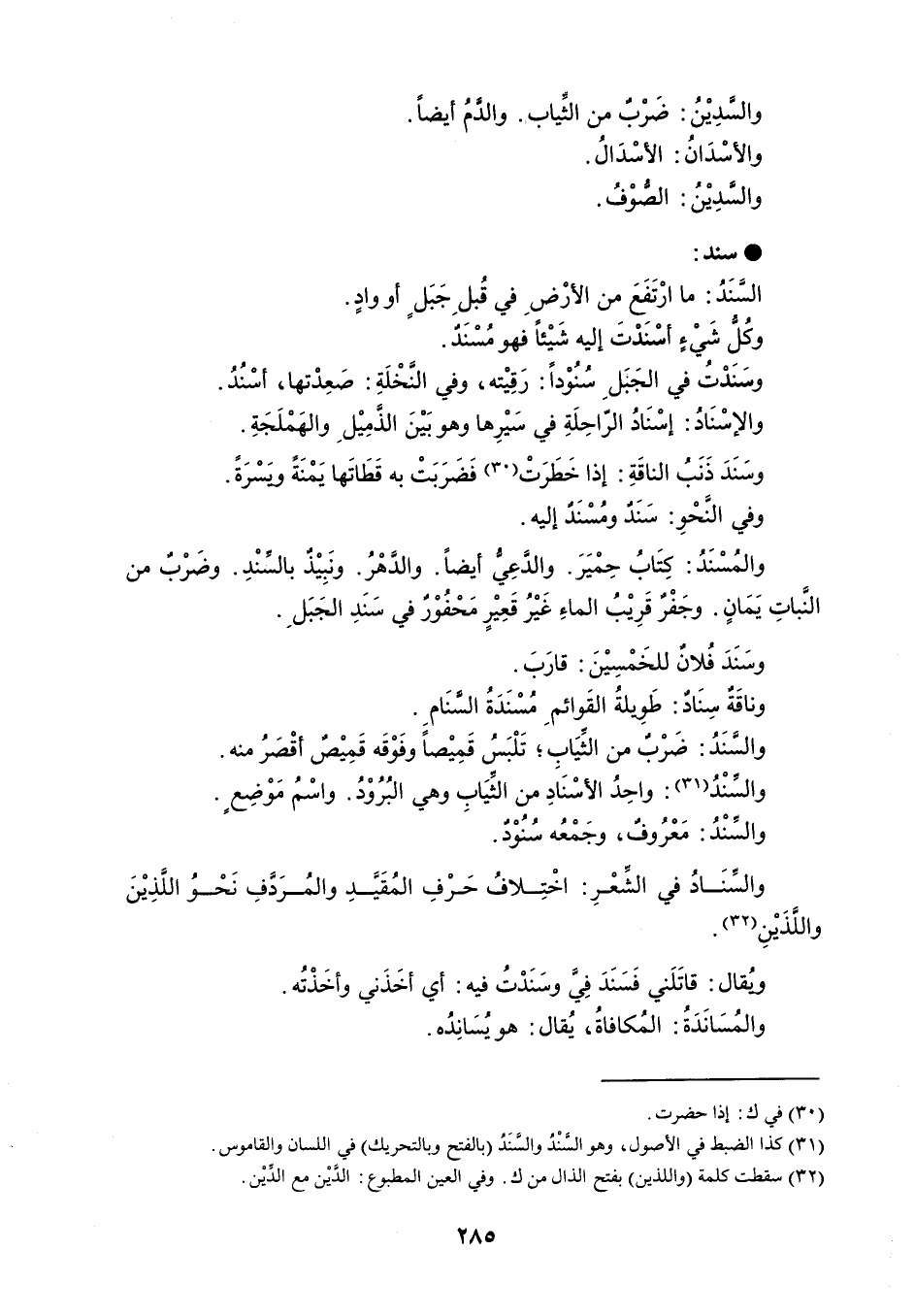 والسدِيْنُ : ضَرْبٌ من الثَياب . والدمُ أيضاً . والأسْدَانُ : الأسْدَالُ . والسدِيْنُ : الصوْفُ . سند السَّنَدُ : ما ارْتَفَعَ من الأرْضِ في قُبلِ جَبَلٍ أو وادٍ . وكُلُّ شَيْءٍ أسْنَدْتَ إليه شَيْئاً فهو مُسْنَد . وسَنَدْتُ في الجَبَلِ سُنُوْداً : رَقِيْته ، وفي النَخْلَةِ : صَعِدْتها ، أسْنُدُ . والإسْنَادُ : إسْنَادُ الراحِلَةِ في سَيْرِها وهو بَيْنَ الذَمِيْلِ والهَمْلَجَةِ . وسَنَدَ ذَنَبُ الناقَةِ : إذا خَطَرَتْ فَضَرَبَتْ به قَطَاتَها يَمْنَة وَيسْرَة . وفي النَحْوِ : سَنَدٌ ومُسْنَدٌ إليه . والمُسْنَدُ : كِتَابُ حِمْيَرَ . والدعِيُّ أيضاً . والدهْرُ . ونَبِيْذٌ بالسِّنْدِ . وضَرْب من النَباتِ يَمَانٍ . وجَفْرٌ قَرِيْبُ الماءِ غَيْرُ قَعِيْرٍ مَحْفُوْر في سَنَدِ الجَبَلِ . وسَنَدَ فُلان للخَمْسِيْنَ : قارَبَ . وناقَةٌ سِنَادٌ : طَوِيلةُ القَوائمِ مُسْنَدَةُ السَّنَامِ . والسَّنَدُ : ضَرْبٌ من الثيَابِ ؛ تَلْبَسُ قَمِيْصاً وفَوْقَه قَمِيْصٌ أقْصَرُ منه . والسنْدُ : واحِدُ الأسْنَادِ من الثِّيَابِ وهي البُرُوْدُ . واسْمُ مَوْضِعٍ . والسنْدُ : مَعْرُوفٌ ، وجَمْعُه سُنُوْد . والسنَادُ في الشِّعْرِ ؛ اخْتِلافُ حَرْفِ المُقَيَّدِ والمُرَدَّفِ نَحْوُ اللَّذِيْنَ واللَّذَيْنِ . وُيقال : قاتَلَني فَسَنَدَ فِيَّ وسَنَدْتُ فيه : أي أخَذَني وأخَذْتُه . والمُسَانَدَةُ : المُكافاةُ ، يُقال : هو يُسَانِدُه .