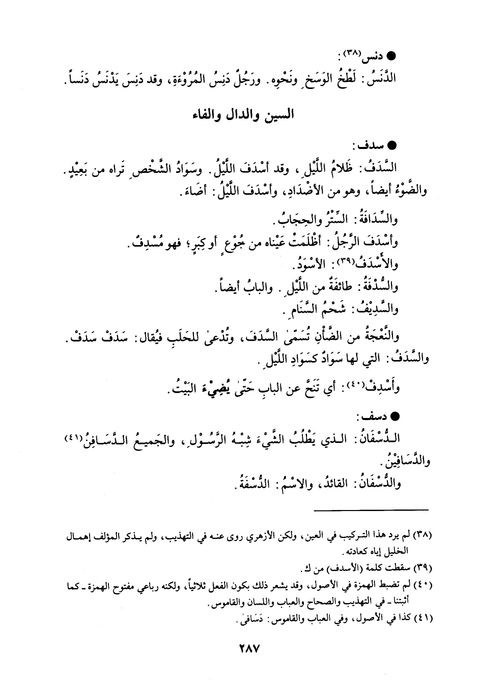سدف السَّدَفُ : ظَلامُ الليْلِ ، وقد أسْدَفَ الليْلُ . وسَوَادُ الشخْصِ تَراه من بَعِيْدٍ . والضوْءُ أيضاً ، وهو من الأضْدَادِ ، وأسْدَفَ اللَّيْلُ : أضَاءَ . والسدَافَةُ : الستْرُ والحِجَابُ . وأسْدَفَ الرَّجُلُ : أظْلَمَتْ عَيْناه من جُوْعٍ أوكِبَرٍ ؛ فهو مُسْدِفٌ . والأسْدَفُ : الأسْوَدُ . والسُّدْفَةُ : طائفَةٌ من اللَّيْلِ . والبابُ أيضاً . والسدِيْفُ : شَحْمُ السنَامِ . والنَّعْجَةُ من الضأنِ تُسَقى السدَفَ ، وتُدْعى للحَلَبِ فيُقال : سَدَفْ سَدَفْ . والسدَفُ : التي لها سَوَاد كسَوَادِ اللَّيْلِ . وأَسْدِفْ : أي تَنَحَّ عن البابِ حَتى يُضِيْءَ البَيْتُ . دسف الدُسْفَانُ : الذي يَطْلُبُ الشَّيْءَ شِبْهُ الرسُوْلِ ، والجَميعُ الدسَافِنُ والدسَافِيْنُ . والدسْفَانُ : القائدُ ، والاسْمُ : الدُّسْفَةُ .