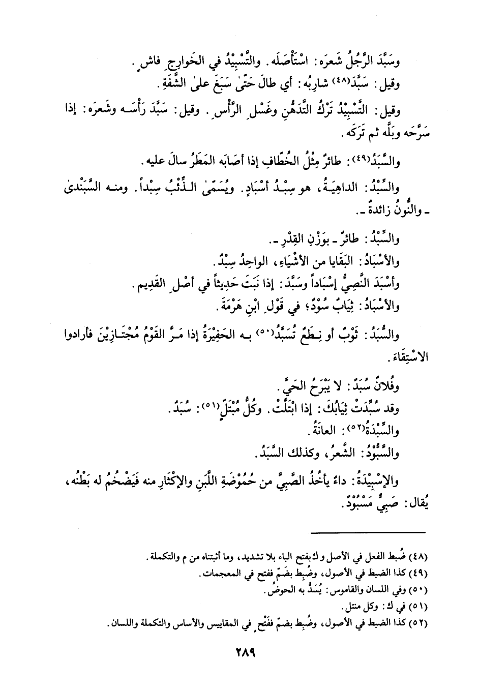 وسَبدَ الرجُلُ شَعره : اسْتَأصَلَه . والتسْبِيْدُ فِي الخَوارِجِ فاشٍ . وقيل : سَبدَ شارِبُه : أي طالَ حَتّى سَبَغ على الشفَةِ . وقيل : التسْبِيْدُ تَرْكُ التَدَهنِ وغَسْلِ الرَّأسِ . وقيل : سَبدَ رَأسَه وشَعرَه : إذا سَرحَه وبَله ثم تَرَكَه . والسبَدُ : طائرٌ مِثْلُ الخُطّافِ إذا أصَابَه المَطَرُ سالَ عليه . والسبْدُ : الداهِيَةُ ، هو سِبْدُ أسْبَادٍ . وُيسَمّى الذَئْبُ سِبْداً . ومنه السبَنْدى - والنُونُ زائدةٌ - . والسبْدُ : طائرٌ - بوَزْنِ القِدْرِ - . والأسْبَادُ : البَقَايا من الأشْيَاءِ ، الواحِدُ سِبْدٌ . وأسْبَدَ النَصِيُّ إسْبَاداً وسَبَّدَ : إذا نَبَتَ حَديثاً في أصْلِ القَدِيم . والأسْبَادُ : ثِيَابٌ سُوْد ؛ في قَوْلِ ابْنِ هَرْمَةَ . والسُّبَدُ : ثَوْب أو نِطَعٌ تُسَبدُ به الحَفِيْرَةُ إذا مَرَّ القَوْمُ مُجْتَازِيْنَ فأرادوا الاسْتِقَاءَ . وفُلان سُبَد : لا يَبْرَحُ الحَي . وقد سبدَتْ ثِيَابُكَ : إذا ابْتَلتْ . وكُلُّ مُبْتَل : سُبَدٌ . والسبْدَةُ : العانَةُ . والسَّبوْدُ : الشعرُ ، وكذلك السَّبَدُ . والإسْبِيْدَةُ : داءٌ يأخُذُ الصبي من حُمُوْضَةِ اللَّبَنِ والإكْثَارِ منه فَيَضْخُمُ له بَطْنُه ، يُقال : صَبِي مَسْبُوْد .