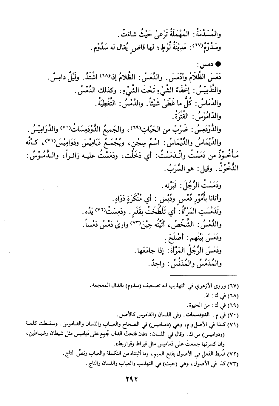 والمُسَدمَةُ : المُهْمَلَةُ تَرْعى حَيْثُ شاءَتْ . وسَدُوْمُ : مَدِيْنَةُ لُوْطٍ ؛ لها قاضٍ يُقال له سَدُوْم . دمس دَمَسَ الظلاَمُ وأدْمَسَ . والدمَسُ : الظلامُ إذا اشْتَدَّ . ولَيْلٌ دامِسٌ . والتَّدْمِيْسُ : إخْفَاءُ الشيْءِ تَحْتَ الشيْءِ ، وكذلك الدَّمْسُ . والدمَاسُ : كُل ما غَطى شَيْئاً . والدمْسُ : التَغْطِيَةُ . والدامُوْسُ : القُتْرَةُ . والدُوْدَمِسُ : ضَرْبٌ من الحَيّاتِ ، والجَميعُ الدُّوْدَمِسَاتُ والدَّوَامِيْسُ . والديْمَاسُ والديْمَاسُ : اسْمُ سِجْنٍ ، ويُجْمَعُ دَيَامِيْسَ ودَوَامِيْسَ ، كأنَه مَأْخُوْذٌ من دَمَسْت وانْدَمَسْتُ : أي دَخَلْت ، ودَمَسْتُ عليه زائراً ، والدُّمُوْسُ : الدُّخُوْلُ . وقيل : هو السَّرَبُ . ودَمَسْتُ الرَّجُلَ : قَبَرْته . وأتانا بأمُوْرٍ دُمْسٍ ودُبْسٍ : أي مُنْكَرَةٍ دَوَاهٍ . وتَدَمَّسَتِ المَرْأةُ : أي تَلَطخَتْ بقَذَرٍ . ودَمِسَتْ يَدُه . والدَّمْسُ : الشخْصُ ، أتَيْتُه حِيْنَ وارى دَمْسٌ دَمْساً . ودَمَسَ بَيْنَهم : أصْلَحَ : ودَمَسَ الرجُلُ المَرْأةَ : إذا جامَعَها . والمُدَمَّسُ والمُدَنَّسُ : واحِدٌ .