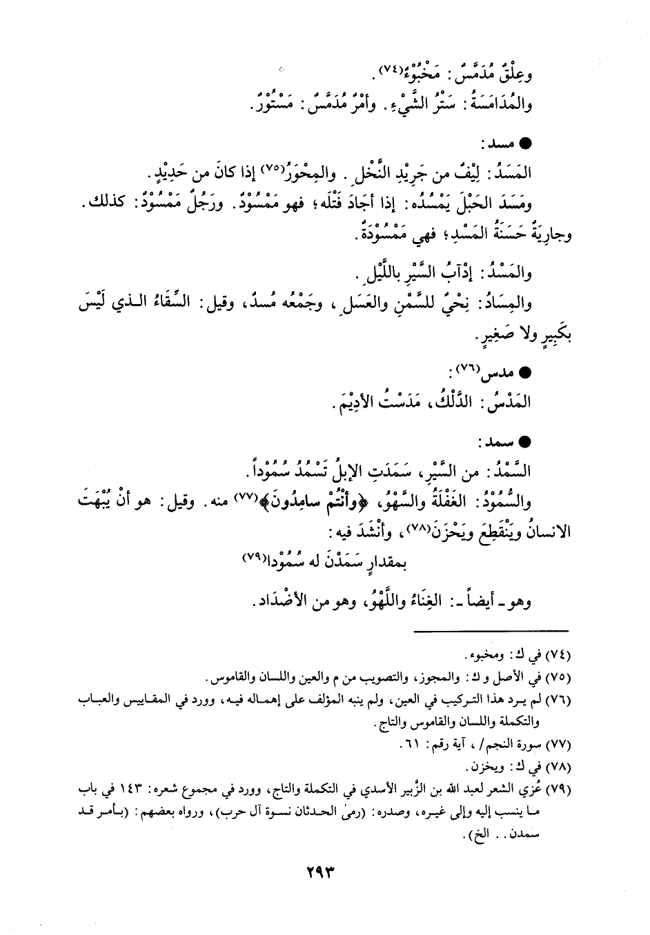 وعِلْقٌ مُدَمس : مَخْبُؤ . والمُدَامَسَةُ : سَتْرُ الشيْءِ . وأمْرٌ مُدَمَّسٌ : مَسْتُوْرٌ . مسد المَسَدُ : لِيْفٌ من جَرِيْدِ النَّخْلِ . والمِحْوَرُ إذا كانَ من حَدِيْدٍ . ومَسَدَ الحَبْلَ يَمْسُدُه : إذا أجَادَ فَتْلَه ؛ فهو مَمْسُوْدٌ . ورَجُلٌ مَمْسُوْدٌ : كذلك . وجارِيَةٌ حَسَنَةُ المَسْدِ ؛ فهي مَمْسُوْدَةٌ . والمَسْدُ : إدْآبُ السَّيْرِ بالليْلِ . والمِسَادُ : نِحْيٌ للسمن والعَسَلِ ، وجَمْعُه مُسدٌ ، وقيل : السِّقَاءُ الذي لَيْسَ بكَبِيرٍ ولا صَغِيرٍ . مدس المَدْسُ : الدلْكُ ، مَدَست الأدِيْمَ . سمد السمْدُ : من السَّيْرِ ، سَمَدَتِ الإبلُ تَسْمُدُ سُمُوداً . والسمُوْدُ : الغَفْلَةُ والسهْوُ ، ' وأنْتُمْ سامِدُونَ ' منه . وقيل : هو أنْ يُبْهَتَ الانسانُ ويَنْقَطِعَ وَيحْزَنَ ، وأنْشَدَ فيه : بمقدارٍ سَمَدْنَ له سُمُوْدا وهو - أيضاً - : الغِنَاءُ واللَّهْوُ ، وهو من الأضْدَاد .