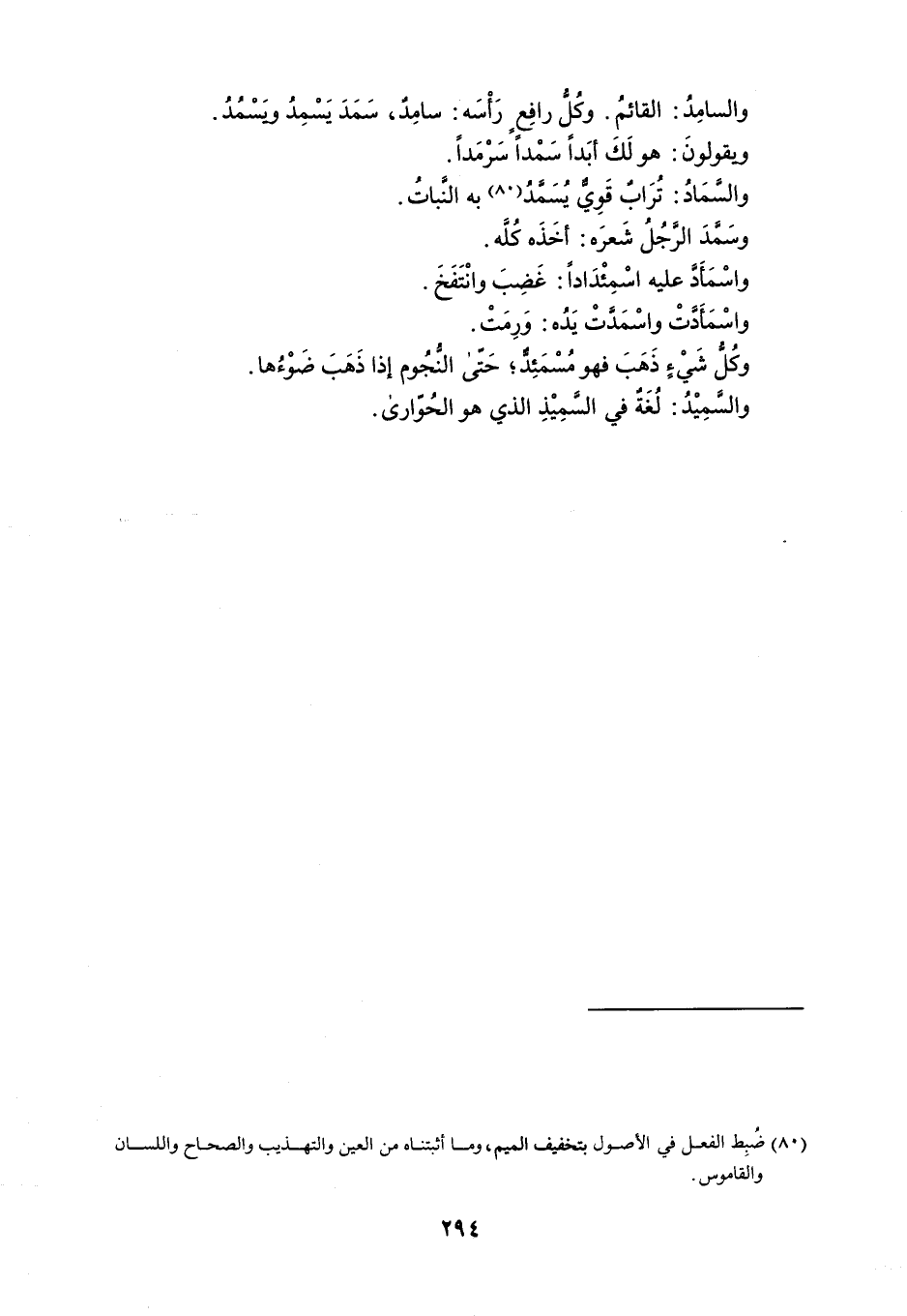 والسامِدُ : القائمُ . وكُلُّ رافِعٍ رَأْسَه : سامِدٌ ، سَمَدَ يَسْمِدُ وَيسْمُد . ويقولونَ : هو لَكَ أبَداً سَمْداً سَرْمَداً . والسمَادُ : تُرَاب قَوِي يُسَمدُ به النَّباتُ . وسَمدَ الرَّجُلُ شَعرَه : أخَذَه كُله . واسْمَأد عليه اسْمِئْدَاداً : غَضِبَ وانْتَفَخَ . واسمأدت واسمئدت يده : وَرِمَتْ . وكُلُ شَيْءٍ ذَهَبَ فهو مُسْمَئِد ؛ حَتّى النُّجُوم إذا ذَهَبَ ضَوْءها . والسمِيْدُ : لُغَةٌ في السَّمِيْد الذي هو الحُوّارى .