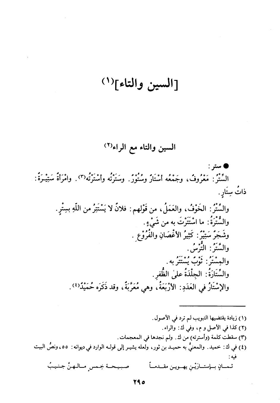 ستر الستْرُ : مَعْرُوف ، وجَمْعُه أسْتَارٌ وسُتُوْر . وسَتَرْتُه وأسْتَرْتُه . وامْرَأةٌ سَتِيْرَةٌ : ذاتُ سِتَارٍ . والستْرُ : الخَوْفُ ، والعَمَل ، من قَوْلهم : فلانٌ لا يَسْتَتِرُ من اللّهِ بسِتْرٍ . والسُتْرَةُ : ما اسْتَتَرْتَ به من شَيْءٍ . وشَجَرٌ سَتِيْرٌ : كَثِيرُ الأغْصَانِ والفُرُوْعِ . والسَّتَرُ : الترْسُ . والمِسْتَرُ : ثَوْبٌ يُسْتَتَرُ به . والستَارَةُ : الجِلْدَةُ على الظُّفرِ . والإسْتَارُ في العَدَدِ : الأرْبَعَةُ ، وهي مُعَربَةٌ ، وقد ذَكَرَه حُمَيْدٌ .