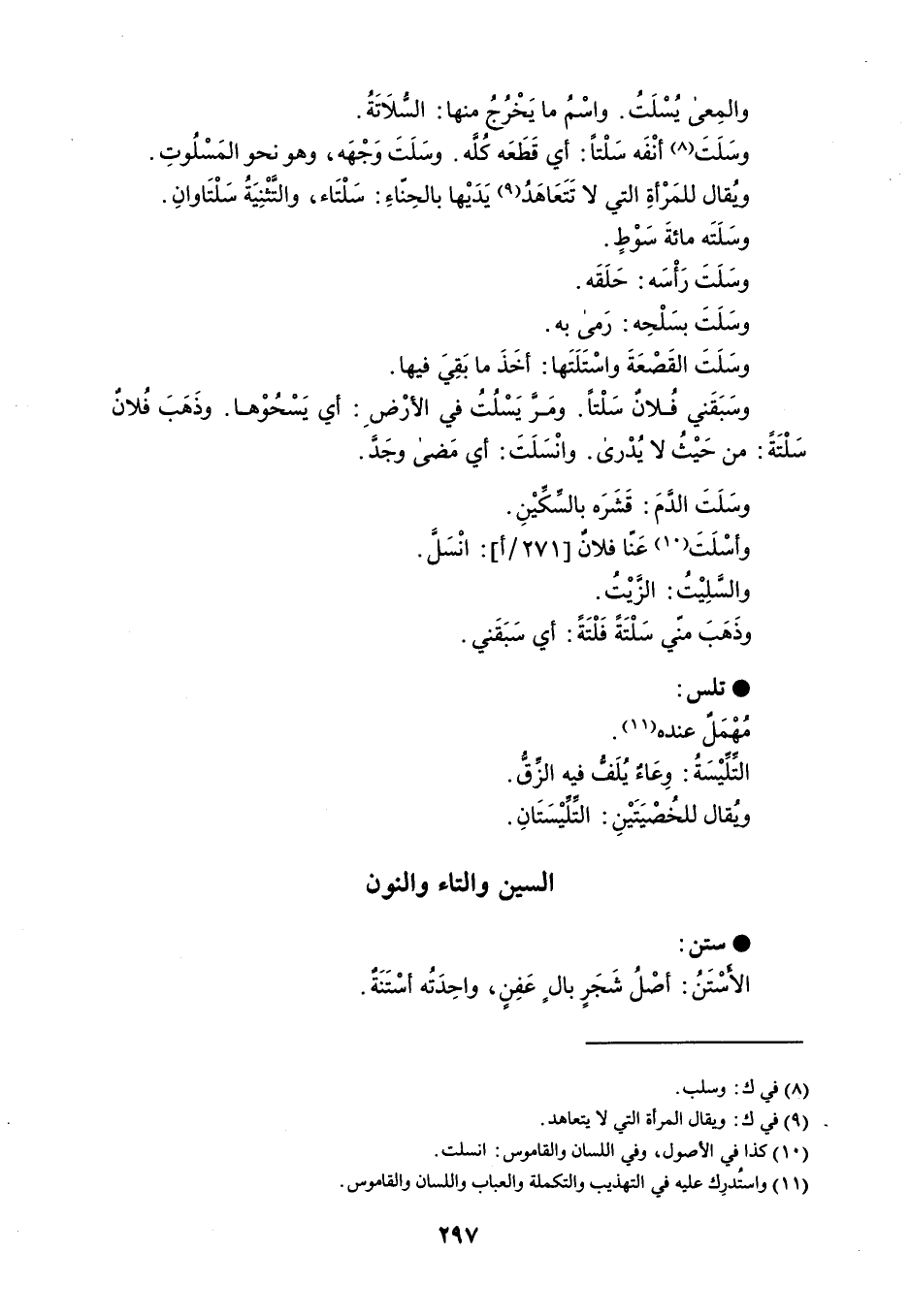 والمِعى يُسْلَتُ . واسْمُ ما يَخْرُجُ منها : السُّلاَتَةُ . وسَلَتَ أنْفَه سَلْتاً : أي قَطَعَه كُله . وسَلَتَ وَجْهَه ، وهو نحو المَسْلُوتِ . وُيقال للمَرْأةِ التي لا تَتَعَاهَدُ يَدَيْها بالحِنّاءِ : سَلْتَاء ، والتَّثْنِيَةُ سَلْتَاوانِ . وسَلَتَه مائةَ سَوْطٍ . وسَلَتَ رَأْسَه : حَلَقَه . وسَلَتَ بسَلْحِه : رَمى به . وسَلَتَ القَصْعَةَ واسْتَلَتَها : أخَذَ ما بَقِيَ فيها . وسَبَقَني فُلانٌ سَلْتاً . ومَرَّ يَسْلُتُ في الأرْضِ : أي يَسْحُوْها . وذَهَبَ فُلانٌ سَلْتَةً : من حَيْثُ لا يُدْرى . وانْسَلَتَ : أي مَضى وجَدَّ . وسَلَتَ الدمَ : قَشَرَه بالسكيْنِ . وأسْلَتَ عَنا فلانٌ : انْسَل . والسلِيْتُ : الزيْتُ . وذَهَبَ منّي سَلْتَةً فَلْتَةً : أي سَبَقَني . تلس مُهْمَل عنده . التِّلَيْسَةُ : وِعَاءٌ يُلَفُ فيه الزَقُ . وُيقال للخُصْيَتَيْنِ : التَلِّيْسَتَانِ .