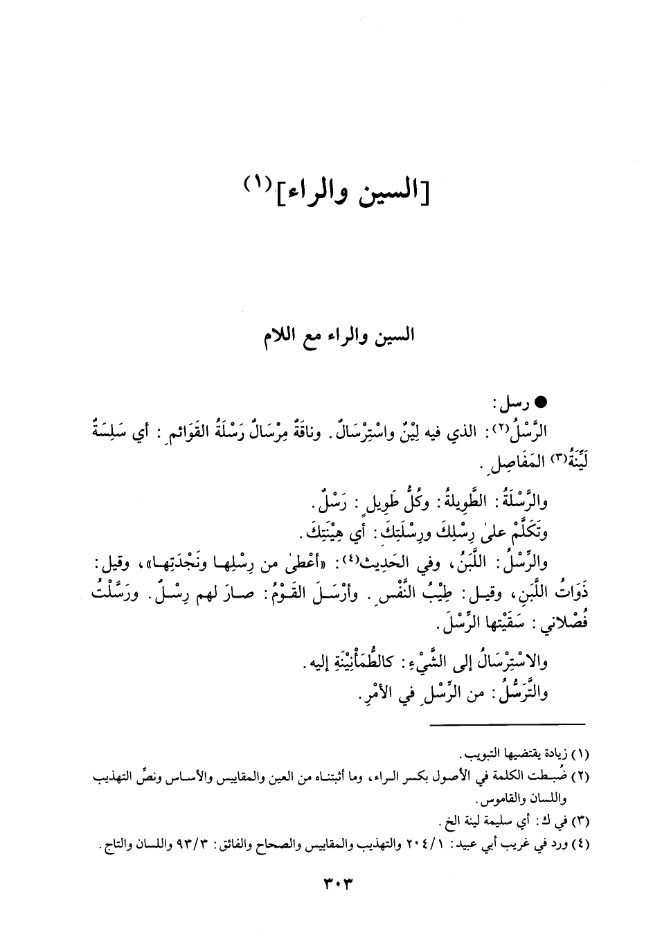 رسل الرسْلُ : الذي فيه لِيْنٌ واسْتِرْسَالٌ . وناقَةٌ مِرْسَالٌ رَسْلَةُ القَوَائمِ : أي سلِسَةٌ لَدنَةُ المَفَاصِلِ . والرسْلَةُ : الطَّوِيلةُ : وكُلُّ طَوِيلٍ : رَسْلٌ . وتَكَلَّمْ على رِسْلِكَ ورِسْلَتِك : أي هِيْنَتِكَ . والرِّسْلُ : اللَّبَنُ ، وفي الحَدِيث : ' أعْطى من رِسْلِها ونَجْدَتِها ' ، وقيل : ذَوَاتُ اللبَنِ ، وقيل : طِيْبُ النَّفْسِ . وأرْسَلَ القَوْمُ : صارَ لهم رِسْلٌ . ورَسَّلْتُ فُصْلاني : سَقَيْتها الرِّسْلَ . والاسْتِرْسَالُ إلى الشَّيْءِ : كالطُّمَأْنِيْنَةِ إليه . والتَرَسلُ : من الرِّسْلِ في الأمْرِ .