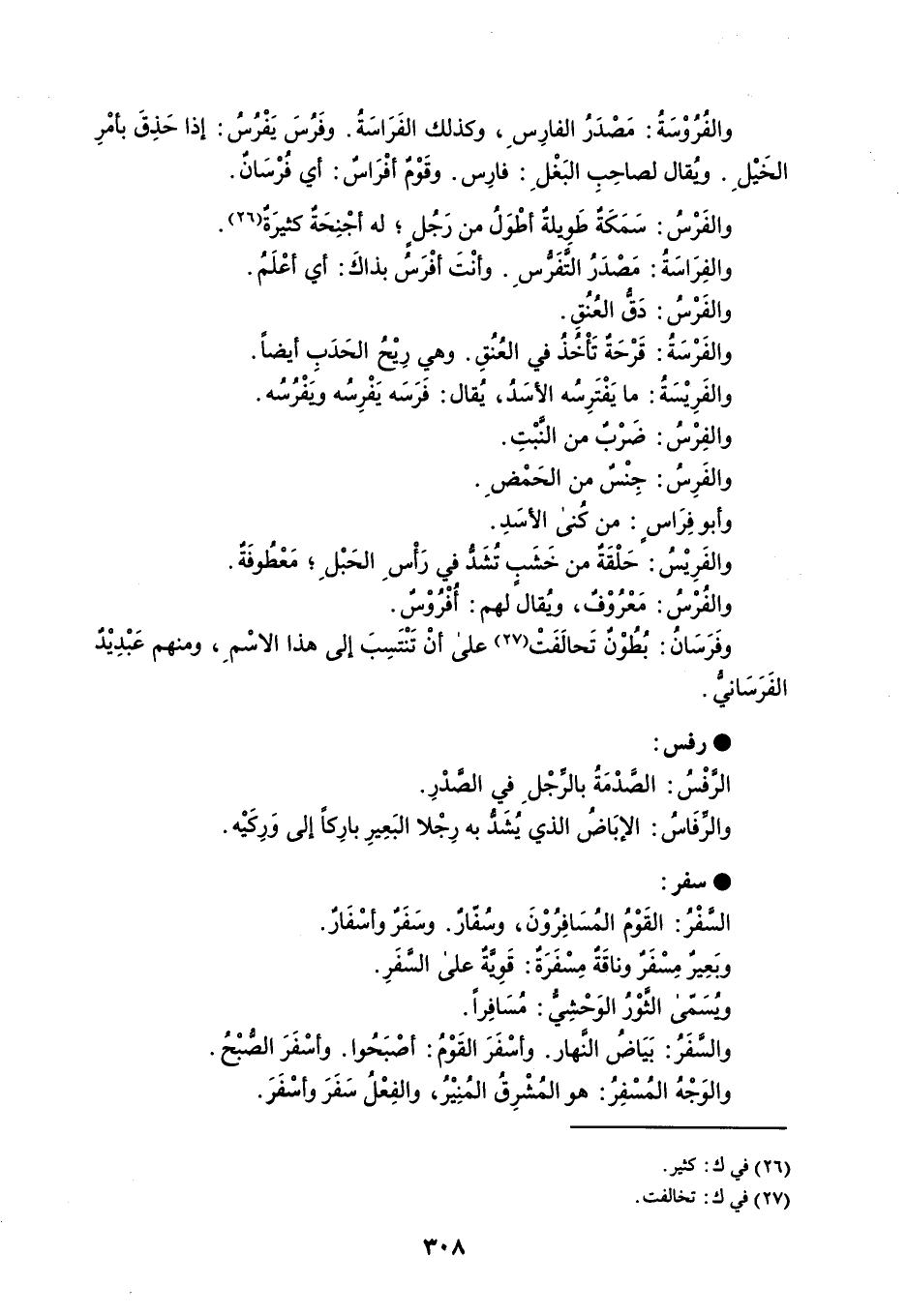 والفُرُوْسَةُ : مَصْدَرُ الفارِسِ ، وكذلك الفَرَاسَةُ . وفَرُسَ يَفْرُسُ : إذا حَذِقَ بأمْرِ الخَيْلِ . ويُقال لصاحِبِ البَغْلِ : فارِس . وقَوْمٌ أفْرَاس : أي فُرْسَانٌ . والفَرْسُ : سَمَكَة طَوِيلة أطْوَلُ من رَجُلٍ ؛ له أجْنِحَةٌ كثيرَةٌ . والفِرَاسَةُ : مَصْدَرُ التَّفَرُّسِ . وأنْتَ أفْرَسُ بذاكَ : أي أعْلَمُ . والفَرْسُ : دَقُ العُنُقِ . والفَرْسَة : قَرْحَة تَأخُذُ في العُنُقِ . وهي رِيْحُ الحَدَبِ أيضاً . والفَرِيْسَةُ : ما يَفْتَرِسُه الأسَدُ ، يُقال : فَرَسَه يَفْرِسُه وَيفْرُسُه . والفِرْسُ : ضَرْبٌ من النبْتِ . والفَرِسُ : جِنْسٌ من الحَمْضِ . وأبو فِرَاسٍ : من كُنى الأسَدِ . والفَرِيْسُ : حَلْقَة من خَشَب تُشَد في رَأْسِ الحَبْلِ ؛ مَعْطُوفَةٌ . والفُرْسُ : مَعْرُوْفٌ ، وُيقال لهم : أُفْرُوْسٌ . وفَرَسَانُ : بُطُوْن تَحالَفَتْ على أنْ تَنْتَسِبَ إلى هذا الاسْمِ ، ومنهم عَبْدِيْدٌ الفَرَسَاني . رفس الرفْسُ : الصدْمَةُ بالرجْلِ في الصدْرِ . والرفَاسُ : الإبَاضُ الذي يُشَد به رِجْلا البَعِيرِ بارِكاً إلى وَرِكَيْه . سفر السفْرُ : القَوْمُ المُسَافِرُوْنَ ، وسُفّار . وسَفَرٌ وأسْفَارٌ . وبَعِيرٌ مِسْفَرٌ وناقَةٌ مِسْفَرَةٌ : قَوِيةٌ على السفَرِ . ويُسَقى الثوْرُ الوَحْشِي : مُسَافِراً . والسَّفَرُ : بَيَاضُ النهار . وأسْفَرَ القَوْمُ : أصْبَحُوا . وأسْفَرَ الصبْح . والوَجْهُ المُسْفِرُ : هو المُشْرِقُ المُنِيْرُ ، والفِعْلُ سَفَرَ وأسْفَرَ .