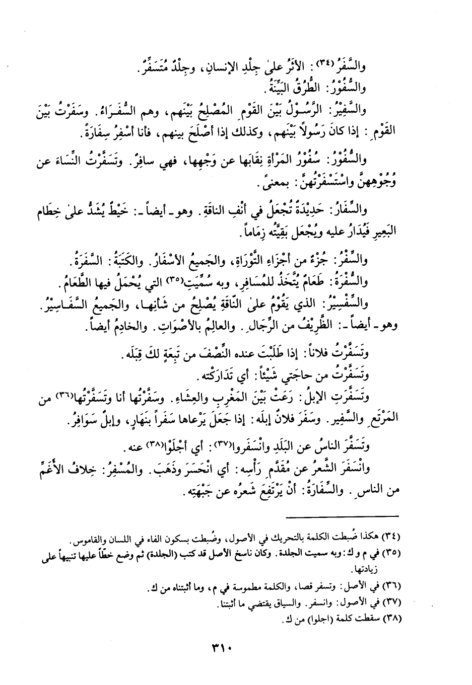 والسفَرُ : الأثَرُ على جِلْدِ الإنسانِ ، وجِلْدٌ مُتَسَفِّرٌ . والسفوْرُ : الطُّرُقُ البَيِّنَةُ . والسفِيْرُ : الرسُوْلُ بَيْنَ القَوْمِ المُصْلِحُ بَيْنَهم ، وهم السُّفَرَاءُ . وسَفَرْتُ بَيْنَ القَوْمِ : إذا كانَ رَسُولاً بَيْنَهم ، وكذلك إذا أصْلَحَ بينهم ، فأنا أسْفِرُ سِفَارَةً . والسُفُوْرُ : سُفُوْرُ المَرْأةِ نِقَابَها عن وَجْهِها ، فهي سافِرٌ . و تَسَفَّرْتُ النِّسَاءَ عن وُجُوْهِهنَّ واشتَسْفَرْتُهنَّ : بمعنى . والسفَارُ : حَدِيْدَةٌ تُجْعَلُ في أنْفِ الناقَةِ . وهو - أيضاً - : خَيْطٌ يُشَدُ على خِطَام البَعِيرِ فَيُدَارُ عليه وُبجْعَل بَقِيَّتُه زِمَاماً . والسفْرُ : جُزْءٌ من أجْزَاءِ التَّوْرَاةِ ، والجَميعُ الأسْفَارُ . والكَتَبَةُ : السَّفَرَةُ . والسُّفْرَةُ : طَعَامٌ يُتَخَذُ للمُسَافِرِ ، وبه سُمِّيَتِ التي يُحْمَلُ فيها الطَّعَامُ . والسفْسِيْرُ : الذي يَقُوْمُ على الناقَةِ يُصْلِح من شَأنِها ، والجَميعُ السَّفَاسِيْرُ . وهو - أيضاً - : الظَّرِيْف من الرجَالِ . والعالِمُ بالأصْوَاتِ . والخادِمُ أيضاً . وتَسَفرْت فلاناً : إذا طَلَبْتَ عنده النَصْفَ من تَبِعَةٍ لكَ قِبَلَه . وتَسَفَرْتُ من حاجَتي شَيْئاً : أي تَدَارَكْته . وتَسَفَرَتِ الإبلُ : رَعَتْ بَيْنَ المَغْرِبِ والعِشَاءِ . وسَفَرْتُها أنا وتَسَفَّرْتُها من المَرْتَعِ والسفِير . وسَفرَ فلان إبلَه : إذا جَعَلَ يَرْعاها سَفَراً بنَهَارٍ ، وإبلٌ سَوَافِرُ . وتَسَفرَ الناسُ عن البَلَدِ وانْسَفَروا : أي أجْلَوْا عنه . وانْسَفَرَ الشعرُ عن مقَدمِ رَأْسِه : أي انْحَسَرَ وذَهَبَ . والمُسْفِرُ : خِلافُ الأغَمِّ من الناسِ . والسِّفَارَةُ : أنْ يَرْتَفِعَ شَعرُه عن جَبْهَتِه .