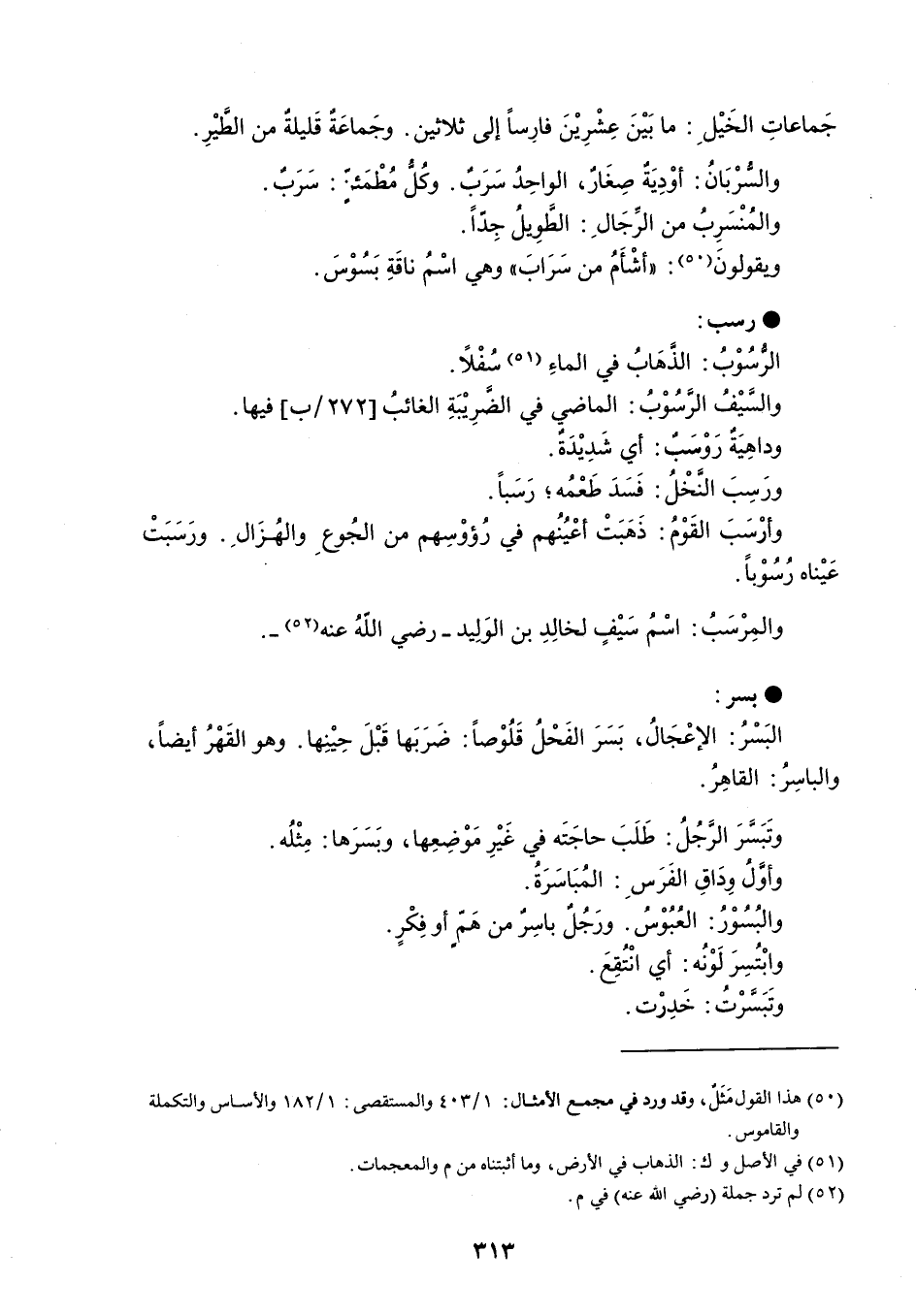 جَماعاتِ الخَيْلِ : ما بَيْنَ عِشْرِيْنَ فارِساً إلى ثلاثين . وجَماعَةٌ قَليلةٌ من الطَّيْرِ . والسرْبَانُ : أوْدِيَةٌ صِغَارٌ ، الواحِدُ سَرَبٌ . وكُلُّ مُطْمَن : سَرَبٌ . والمُنْسَرِبُ من الرجَالِ : الطوِيلُ جِدّاً . ويقولونَ : ' أشْأَمُ من سَرَابَ ' وهي اسْمُ ناقَةِ بَسُوْسَ . رسب الرُسُوْبُ : الذَهَابُ في الماءِ سُفْلاً . والسيْفُ الرَّسُوْبُ : الماضي في الضَّرِيْبَةِ الغائبُ فيها . وداهِيَةٌ رَوْسَب : أي شَدِيْدَةٌ . ورسبِ النَّخْلُ : فَسَدَ طَعْمُه ؛ رَسَباً . وأرْسب القَوْمُ : ذَهَبَتْ أعْيُنُهم في رُؤوْسِهم من الجُوعِ والهُزَالِ . ورَسَبَتْ عَيْناه رُسُوْباً . والمِرْسبُ : اسْمُ سَيْفٍ لخالِدِ بن الوَلِيد - رضي اللّهُ عنه - . بسر البَسْرُ : الإعْجَالُ ، بَسَرَ الفَحْلُ قَلُوْصاً : ضَرَبَها قَبْلَ حِيْنِها . وهو القَهْرُ أيضاً ، والباسِرُ : القاهِرُ . وتَبَسرَ الرجُلُ : طَلَبَ حاجَتَه في غَيْرِ مَوْضِعِها ، وبَسَرَها : مِثْلُه . وأولُ وِدَاقِ الفَرَسِ : المُبَاسَرة . والبُسُوْرُ : العُبُوْسُ . ورَجُلٌ باسِرٌ من هَم أو فِكْرٍ . وابْتُسِرَ لَوْنُه : أي انْتُقِعَ . وتَبَسرْتُ : خَدِرْت .