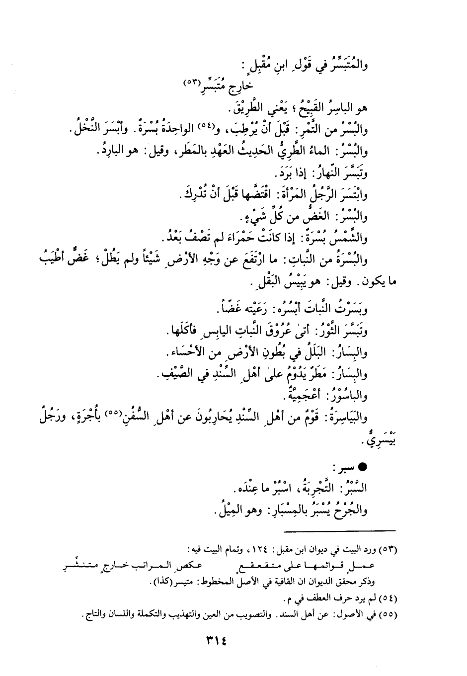 والمُتَبَسرُ في قَوْلِ ابنِ مُقْبِلٍ : خارِج مُتَبَسرِ هو الباسِرُ القَبِيْحُ ؛ يَعْني الطرِيْقَ . والبُسْرُ من التَمْرِ : قَبْلَ أنْ يُرْطِبَ ، والواحِدَةُ بُسْرَة . وأبْسَرَ النخْلُ . والبُسْر : الماءُ الطرِي الحَدِيثُ العَهْدِ بالمَطَر ، وقيل : هو البارِدُ . وتَبَسرَ النهارُ : إذا بَرَدَ . وابْتَسَرَ الرَّجُلُ المَرْأةَ : اقْتَضها قَبْلَ أنْ تُدْرِكَ . والبُسْرُ : الغَضُّ من كُل شَيْءٍ . والشمْسُ بُسْرَةٌ : إذا كانتْ حَمْرَاءَ لم تَصْفُ بَعْدُ . والبُسْرَةُ من النَباتِ : ما ارْتَفَعَ عن وَجْهِ الأرْضِ شَيْئاً ولم يَطُلْ ؛ غَضّ أطْيَبُ ما يكون . وقيل : هو يَبِيْسُ البَقْلِ . وبَسَرْتُ النَباتَ أبْسُرُه : رَعَيْته غَضّاً . وتَبَسرَ الثوْرُ : أتى عُرُوْقَ النَّباتِ اليابِسِ فأكَلَها . والبِسَارُ : البَلَلُ في بُطُونِ الأرْضِ من الأحْسَاء . والبِسَارُ : مَطَرٌ يَدُوْمُ على أهْلِ السنْدِ في الصيْفِ . والباسُوْرُ : أعْجَمِيةٌ . والبَيَاسِرَةُ : قَوْمٌ من أهْلِ السنْدِ يُحَارِبونَ عن أهْلِ السُّفُنِ بأجْرَةٍ ، ورَجُلٌ بَيْسَرِيٌ . سبر السبْرُ : التجْرِبَةُ ، اسْبُرْ ما عِنْدَه . والجُرْحُ يُسْبَرُ بالمِسْبَارِ : وهو المِيْلُ .