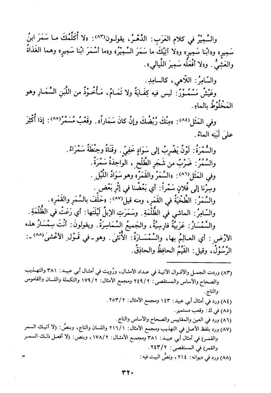 والسمِيْرُ في كلام العَرَبِ : الدهْرُ ، يقولون : ' لا أُكَلمُكَ ما سَمَرَ ابنُ سَمِيرٍ ' و ' ابْنا سَمِير ' و ' لا آتِيْكَ ما سَمَرَ السمِيْرُ ' و ' ما أسْمَرَ ابْنا سَمِير ' وهما الغدَاةُ والعَشِيُ . و ' لا أفْعَله سَمِيرَ اللَّيالي ' . والسامِرُ : اللّاهي ، كالسامِدِ . وعَيْشٌ مَسْمُوْرٌ : ليس فيه كِفَايَةٌ ولا تَمَام ، مَأخُوْذ من اللَّبَن السمَارِ وهو المَخْلُوْطُ بالماءِ . وفي المَثَل : ' مِنْكَ رُبْضُكَ وإنْ كانَ سَمَاراً ' . وقَعْبٌ مُسَقَرٌ : إذا أُكْثِرَ على لَبَنِه الماءُ . والسُّمْرَةُ : لَوْنٌ يَضْرِبُ إلى سَوَادٍ خَفِيٍّ . وقَنَاة وحِنْطَةٌ سَمْرَاءُ . والسمُرُ : ضَرْبٌ من شَجَرِ الطَّلْحِ ، الواحِدَةُ سَمُرَةٌ . وفي المَثَل : ' السمَرُ والقَمَرُ ' وهو سَوَادُ اللَّيْلِ . وسِرْنا إلى فُلانٍ سَمْراً : أي بَعْضُنا في إثْرِ بَعْضٍ . والسَّمَرُ : الطخْيَةُ في القَمَرِ ، ومنه قيل : ' حَلَفَ بالسَّمَرِ والقَمَرِ ' . والسّامِرُ : الماشي في الظُلْمَةِ . وسَمَرَتِ الإبلُ لَيْلَتَها : أي رَعَتْ في الظّلْمَةِ . والسِّمْسَارُ : عَرَبيةٌ فارِسِيةٌ ، والجَميعُ السَّمَاسِرَةُ . ويقولونَ : أنْتَ سِمْسَارُ هذه الأرْضِ : أي العالِمُ بها ، والسمْسَارَةُ : الأنْثى . وهو - في قَوْلِ الأعْشى - : الرسُوْلُ ، وقيل : القَيمُ الحافِظُ والحاذِقُ .