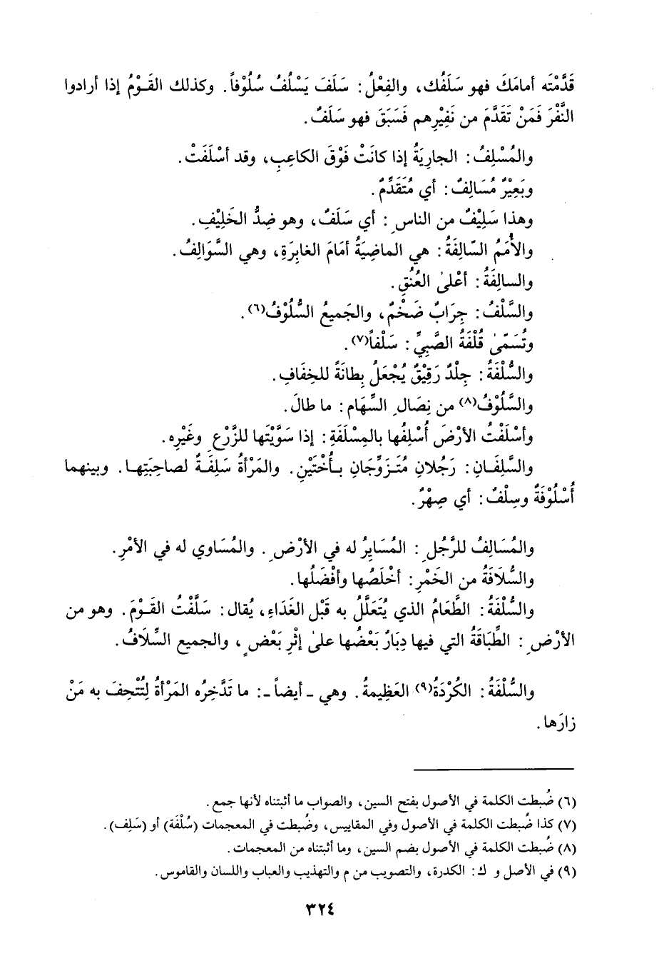 قَدمْتَه أمامَكَ فهو سَلَفُك ، والفِعْلُ : سَلَفَ يَسْلُفُ سُلُوْفاً . وكذلك القَوْمُ إذا أرادوا النَفْرَ فَمَنْ تَقَدمَ من نَفِيْرِهم فَسَبَقَ فهو سَلَفٌ . والمُسْلِفُ : الجارِيَةُ إذا كانَتْ فَوْقَ الكاعِبِ ، وقد أسْلَفَتْ . وبَعِيْرٌ مُسَالِفٌ : أي مُتَقَدِّمٌ . وهذا سَلِيْفٌ من الناسِ : أي سَلَفٌ ، وهو ضِد الخَلِيْفِ . والأمَمُ السالِفَةُ : هي الماضِيَةُ أمَامَ الغابِرَةِ ، وهي السَّوَالِفُ . والسالِفَةُ : أعْلى العُنُقِ . والسَّلْفُ : جِرَابٌ ضَخمٌ ، والجَميعُ السلُوْفُ . وتُسَمّى قُلْفَةُ الصبِي : سَلْفاً . والسُلْفَةُ : جِلْدٌ رَقِيْقٌ يُجْعَلُ بِطانَة للخِفَافِ . والسَّلُوْفُ منِ نِصَالِ السِّهَام : ما طالَ . وأسْلَفْتُ الأرْض أُسْلِفُها بالمِسْلَفَةِ : إذا سَويْتَها للزَرْعِ وغَيْرِه . والسلِفَانِ : رَجُلانِ مُتَزَوجَانِ بأخْتَيْنِ . والمَرْأةُ سَلِفَةٌ لصاحِبَتِها . وبينهما أُسْلُوْفَةٌ وسِلْفٌ : أي صِهْرٌ . والمُسَالِفُ للرَّجُلِ : المُسَايِرُ له في الأرْضِ . والمُسَاوي له في الأمْرِ . والسُلَافَةُ من الخَمْرِ : أخْلَصُها وأفْضَلُها . والسُلْفَةُ : الطعَامُ الذي يُتَعَلَّلُ به قَبْل الغَدَاءِ ، يُقال : سَلَّفْتُ القَوْمَ . وهو من الأرْضِ : الطبَاقَةُ التي فيها دِبَار بَعْضُها على إثْرِ بَعْضٍ ، والجميع السِّلَافُ . والسُّلْفَةُ : الكُرْدَةُ العَظِيمةُ . وهي - أيضاً - : ما تَدخِرُه المَرْأةُ لِتُتْحِفَ به مَنْ زارَها .