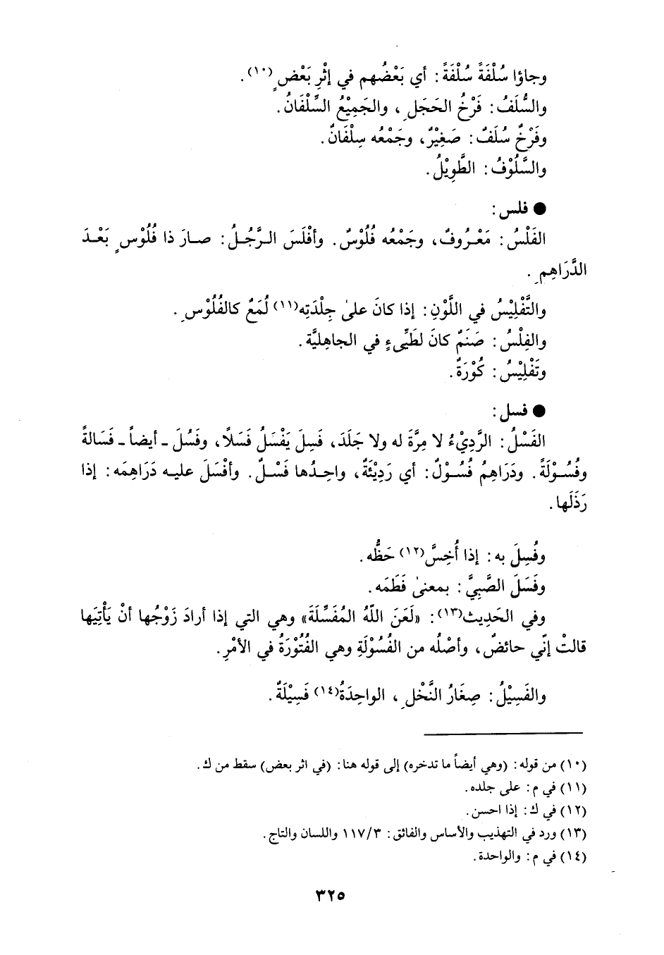 وجاؤا سُلْفَةً سُلْفَةً : أي بَعْضُهم في إثْرِ بَعْض والسُلَفُ : فَرْخُ الحَجَلِ ، والجَمِيْعُ السلْفَانُ . وفَرخٌ سُلَفٌ : صغِيْرٌ ، وجَمْعُه سِلْفَان . والسَّلُوْفُ : الطوِيْلُ . فلس الفَلْسُ : مَعْرُوفٌ ، وجَمْعُه فُلُوْسٌ . وأفْلَسَ الرجُلُ : صارَ ذا فُلُوْسٍ بَعْدَ الدرَاهِمَ . والتَفْلِيْسُ في اللوْنِ : إذا كانَ على جِلْدَتِه لُمَعٌ كالفُلُوْسِ . والفِلْسُ : صنَمٌ كانَ لطيئ في الجاهِليَّة . وتَفْلِيْسُ : كُوْرَة . فسل الفَسْلُ : الردِيْءُ لا مِرَّةَ له ولا جَلَدَ ، فَسِلَ يَفْسَلُ فَسَلاً ، وفَسُلَ - أيضاً - فَسَالةً وفُسُوْلَةً . ودَرَاهِمُ فُسُوْل : أي رَدِيْئَة ، واحِدُها فَسْلٌ . وأفْسَلَ عليه دَرَاهِمَه : إذا رَذَلَها . وفُسِلَ به : إذا أُخِس حَظُّه . وفَسَلَ الصَبِيَّ : بمعنى فَطَمَه . وفي الحَدِيث : ' لَعَنَ اللّهُ المُفَسٌلَةَ ' وهي التي إذا أرادَ زَوْجُها أنْ يَأتِيَها قالتْ إني حائضٌ ، وأصْلُه من الفُسُوْلَةِ وهي الفُتُوْرَةُ في الأمْرِ . والفَسِيْلُ : صِغَارُ النَخْلِ ، الواحِدَةُ فَسِيْلَةٌ .