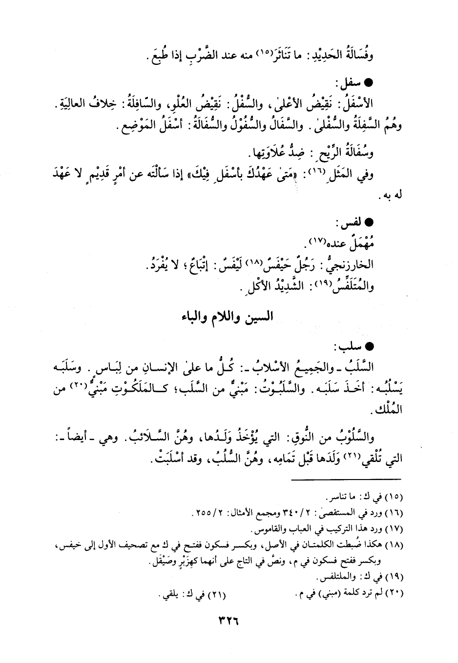 وفُسَالَةُ الحَدِيْدِ : ما تَنَاثَرَ منه عند الضَرْبِ إذا طُبعَ . سفل الأسْفَلُ : نَقِيْضُ الأعْلى ، والسُفْلُ : نَقِيْضُ العلْوِ ، والسّافِلَةُ : خِلافُ العالِيَةِ . وهُمُ السفِلَةُ والسُفْلى . والسفَالُ والسُّفُوْلُ والسُفَالَة : أسْفَلُ المَوْضِع . وسُفَالَةُ الريْحِ : ضِد عُلَاوتها . وفي المَثَلِ : ' مَتى عَهْدُكَ بأسْفَلِ فِيْكَ ' إذا سَألْتَه عن أمْرٍ قَدِيْمٍ لا عَهْدَ له به . لفس مُهْمَلٌ عنده . الخارزنجيُ : رَجُلٌ حَيْفَسٌ لَيْفَس : إتْبَاع ؛ لا يُفْرَدُ . والمُتَلَفَسُ : الشَّدِيْدُ الأكْلِ .